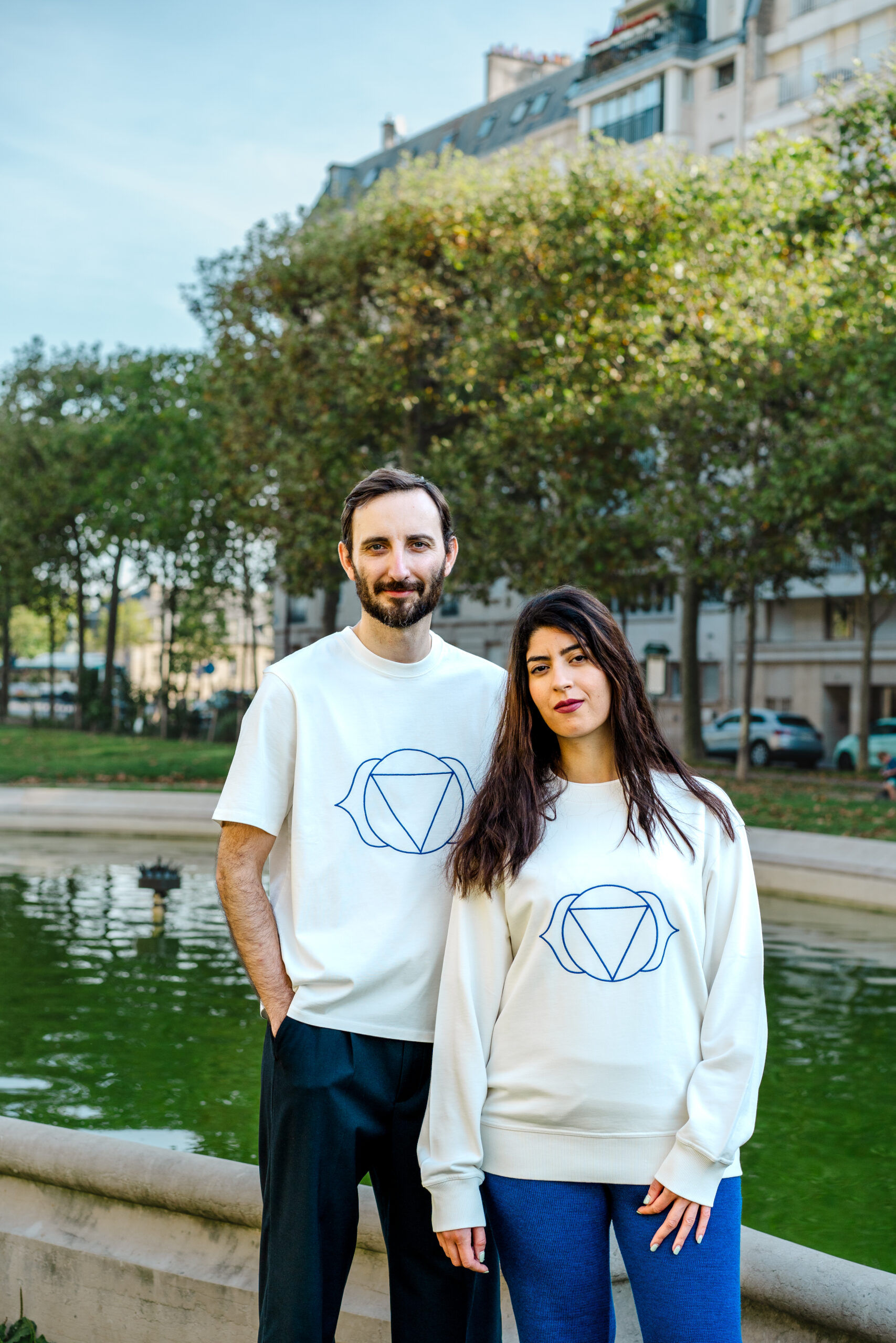 Indigo 3rd Eye Chakra symbol embroidered in biodegradable Tencel threads center front.