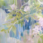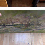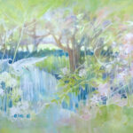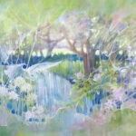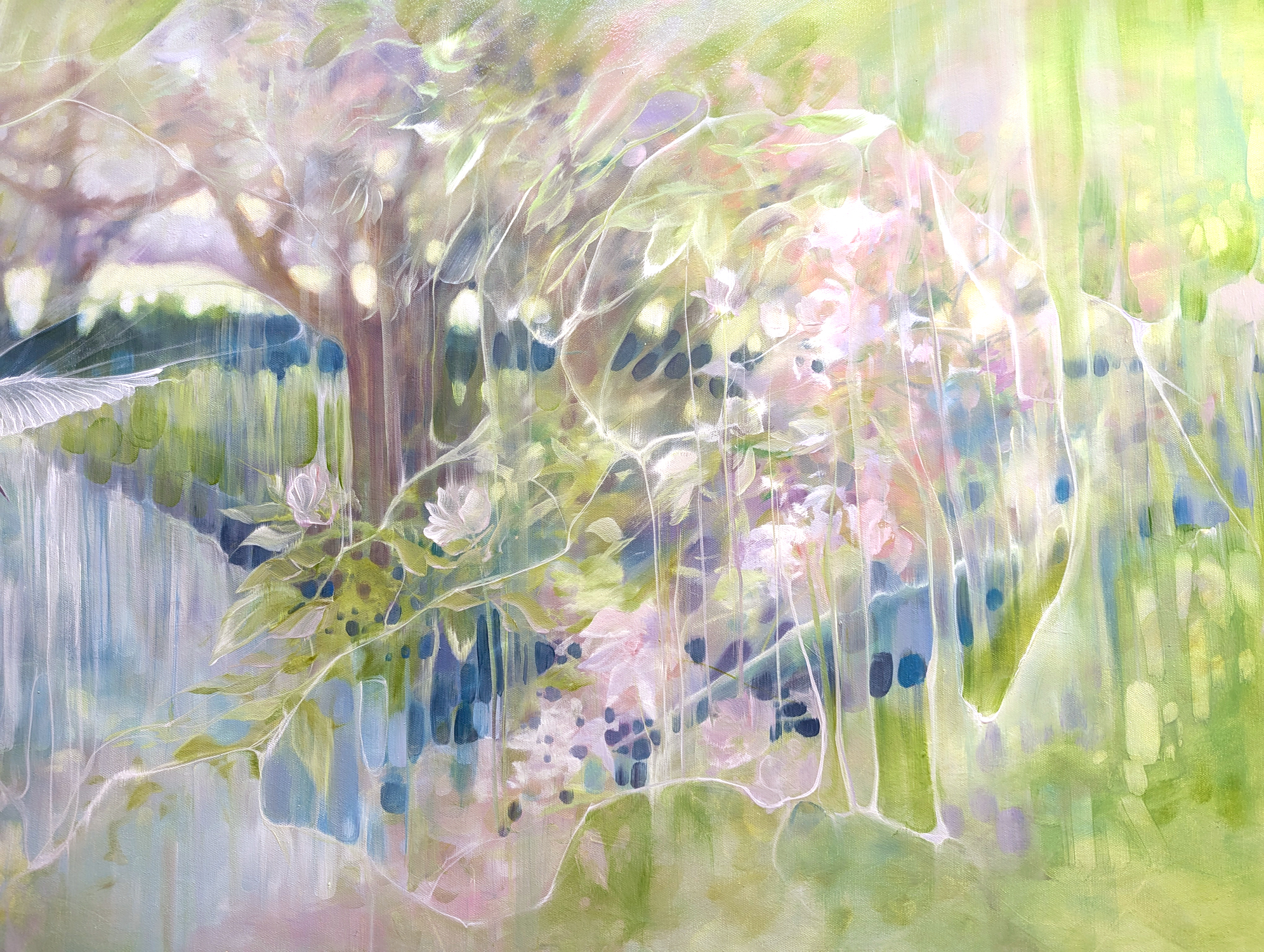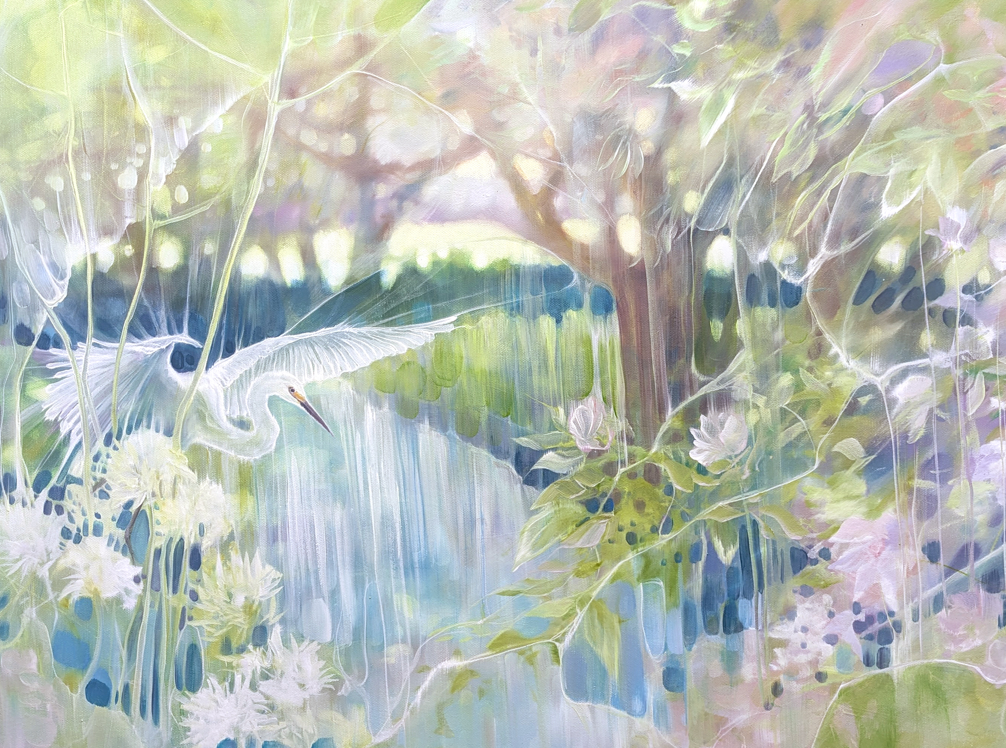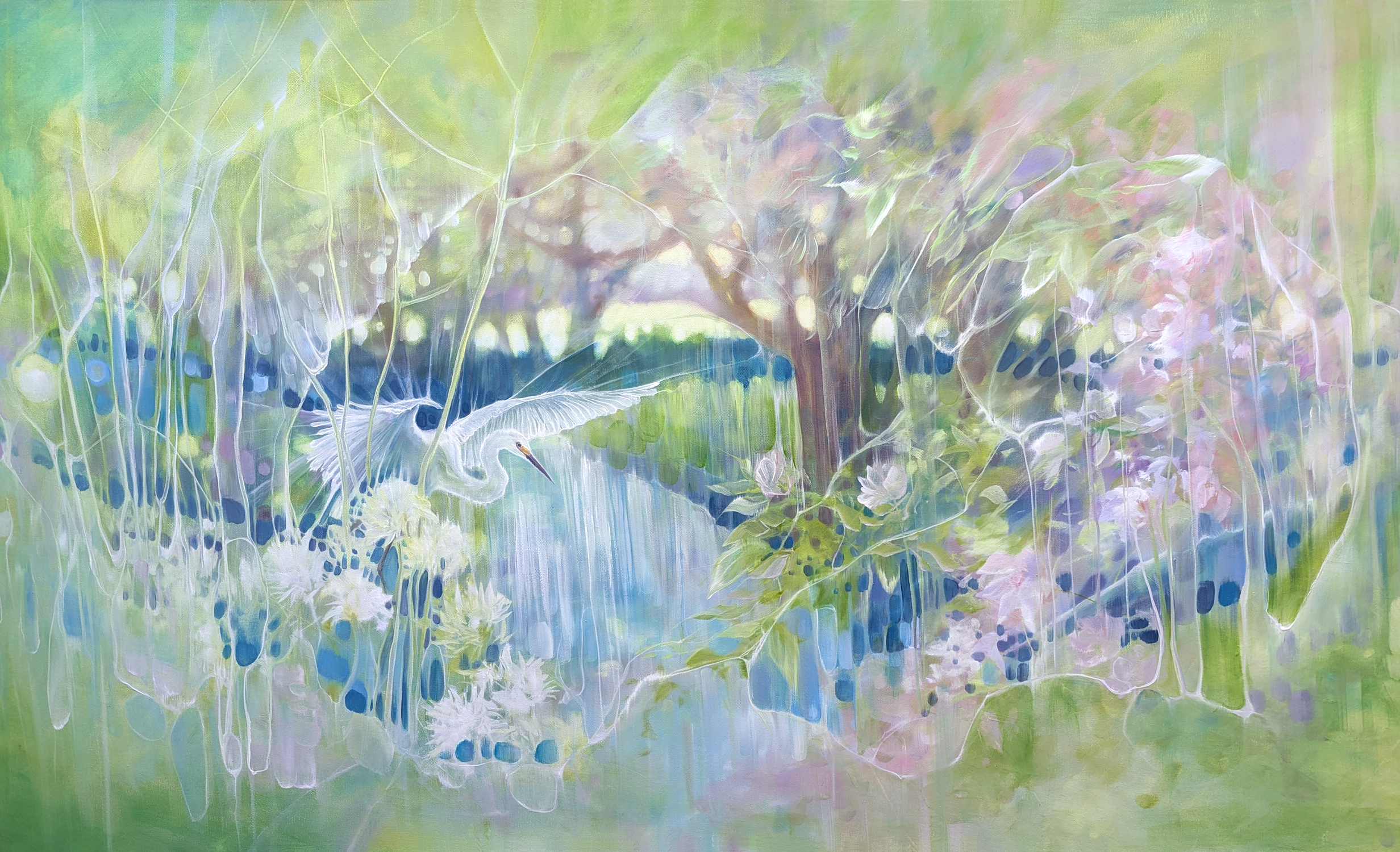 A Quiet Drama is a serene panoramic oil painting of a white egret by a river among trees and blossom and wildflowers.