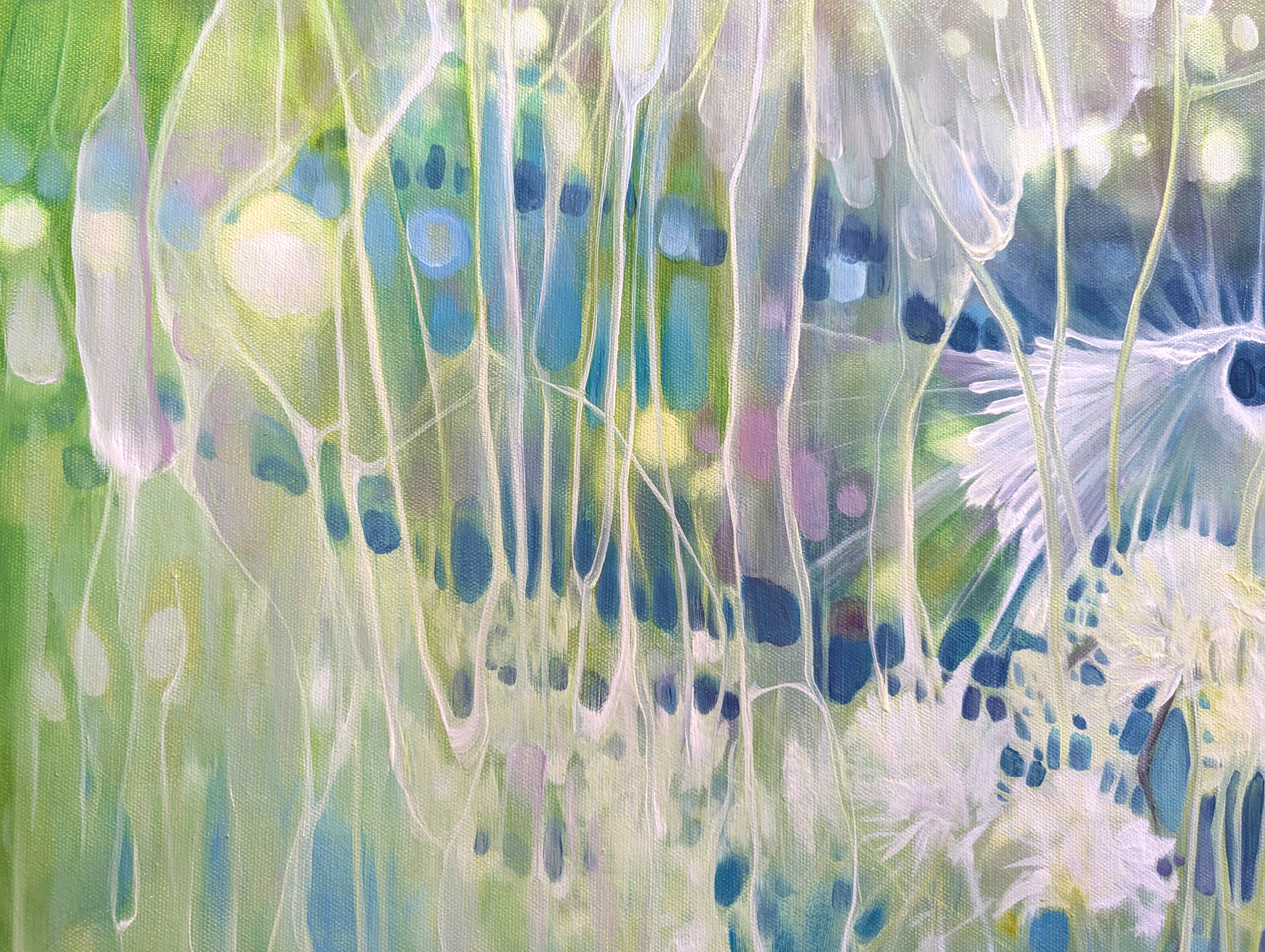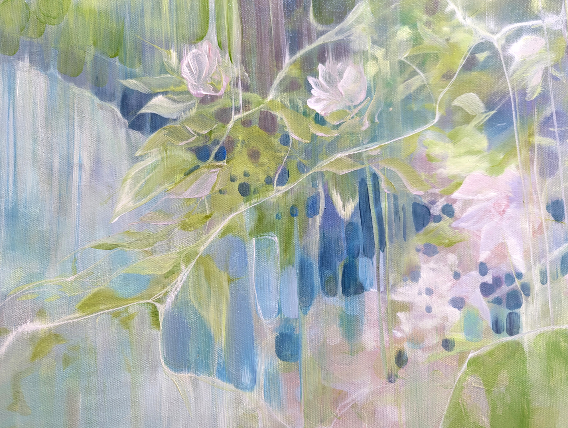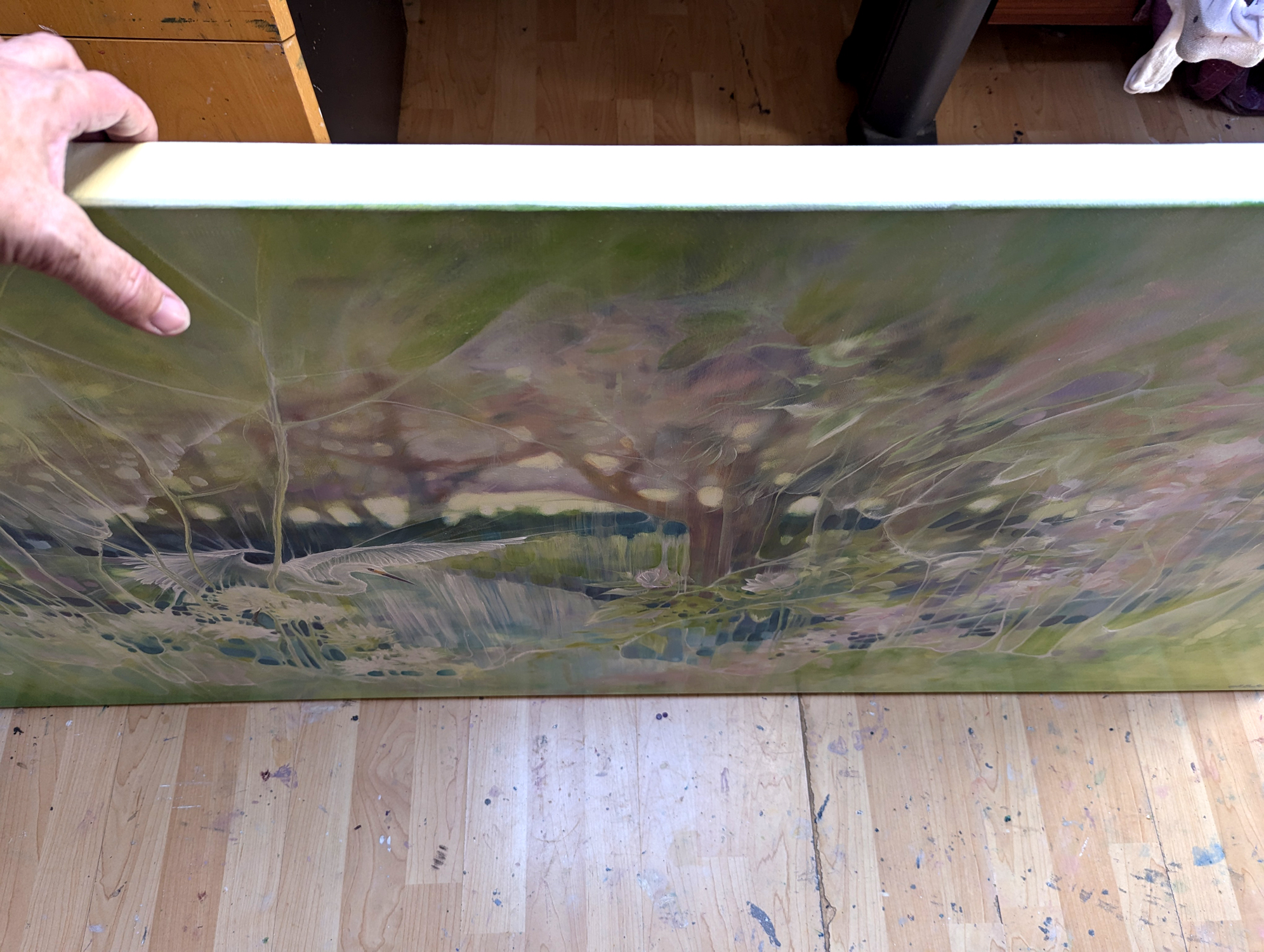 A Quiet Drama is a serene panoramic oil painting of a white egret by a river among trees and blossom and wildflowers. It is 60x30x1.5 inches. The painting style is unique but could be described as semi-abstract style painterly art nouveau. The egret is stretching her wings over the river behind wild garlic and blossom trees and the hint of other riverside flowers. There are trees and fields beyond her but the egret is enclosed in the shade of a quiet river bank just doing what she does. This painting was inspired by my regular walks along parts of the river Medway and celebrates the occasional sighting of a white egret. It is always a pleasure to find these birds as they are so ethereal, white and elegant. I have used the colours of an English springtime (white, pinks, greens, blues and turquoise) to give this painting an ephemeral feeling as May does not last long enough in my opinion! The painting is dedicated to those people helping to get our rivers cleaned up so that wildlife can thrive in them. Painted on deep edge canvas, white edges, no frame needed and ready to hang. Video: https://www.youtube.com/watch?v=qEZrwvOdjzc