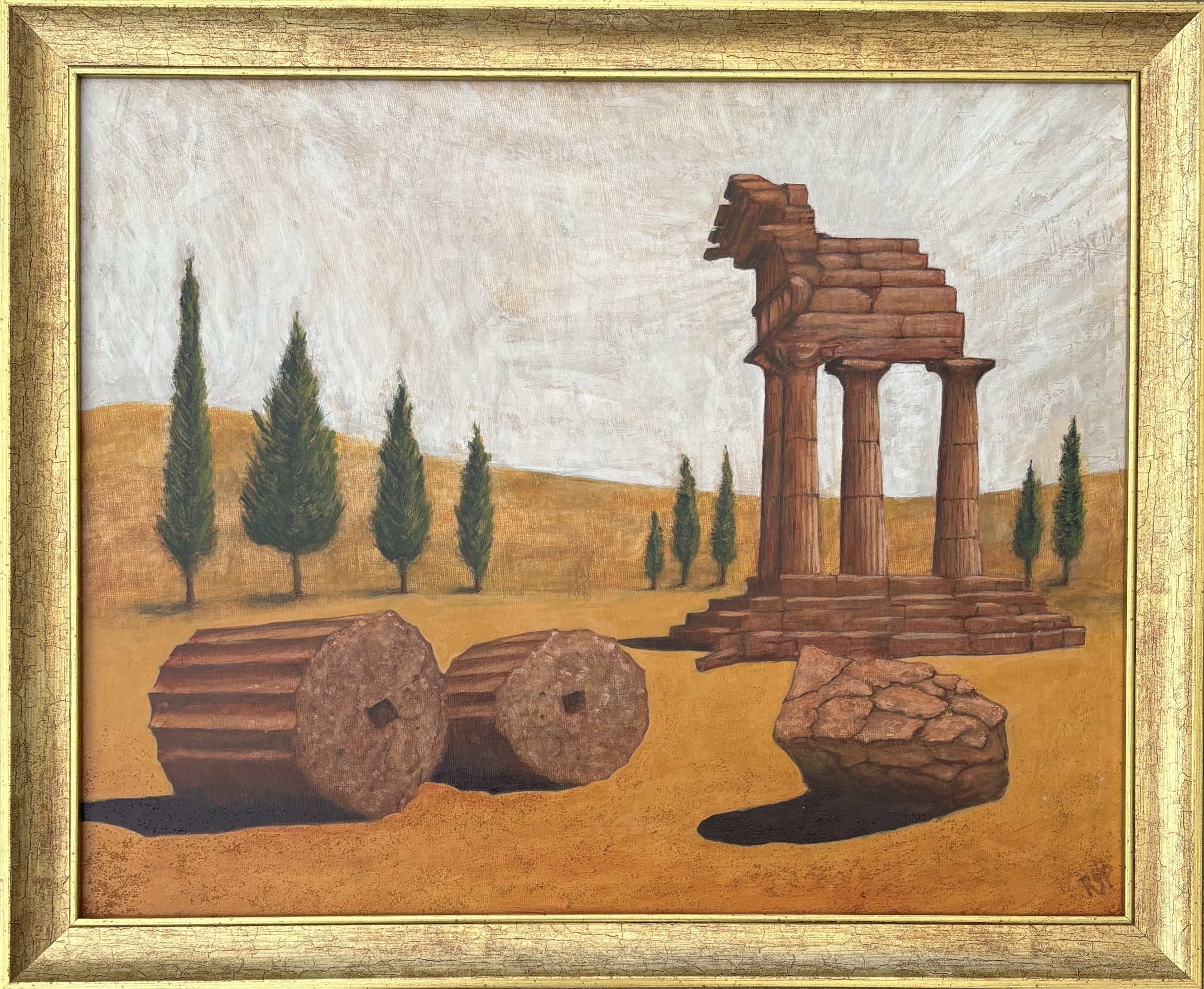 An original acrylic painting on canvas board depicting some of the ancient Roman ruins at Agrigento in Sicily and aiming to convey the impression of a very hot day. The frame is finished in “Antique Gold”. There is no glass in the frame, but the painting is finished with a thin coat of glazing medium for protection.