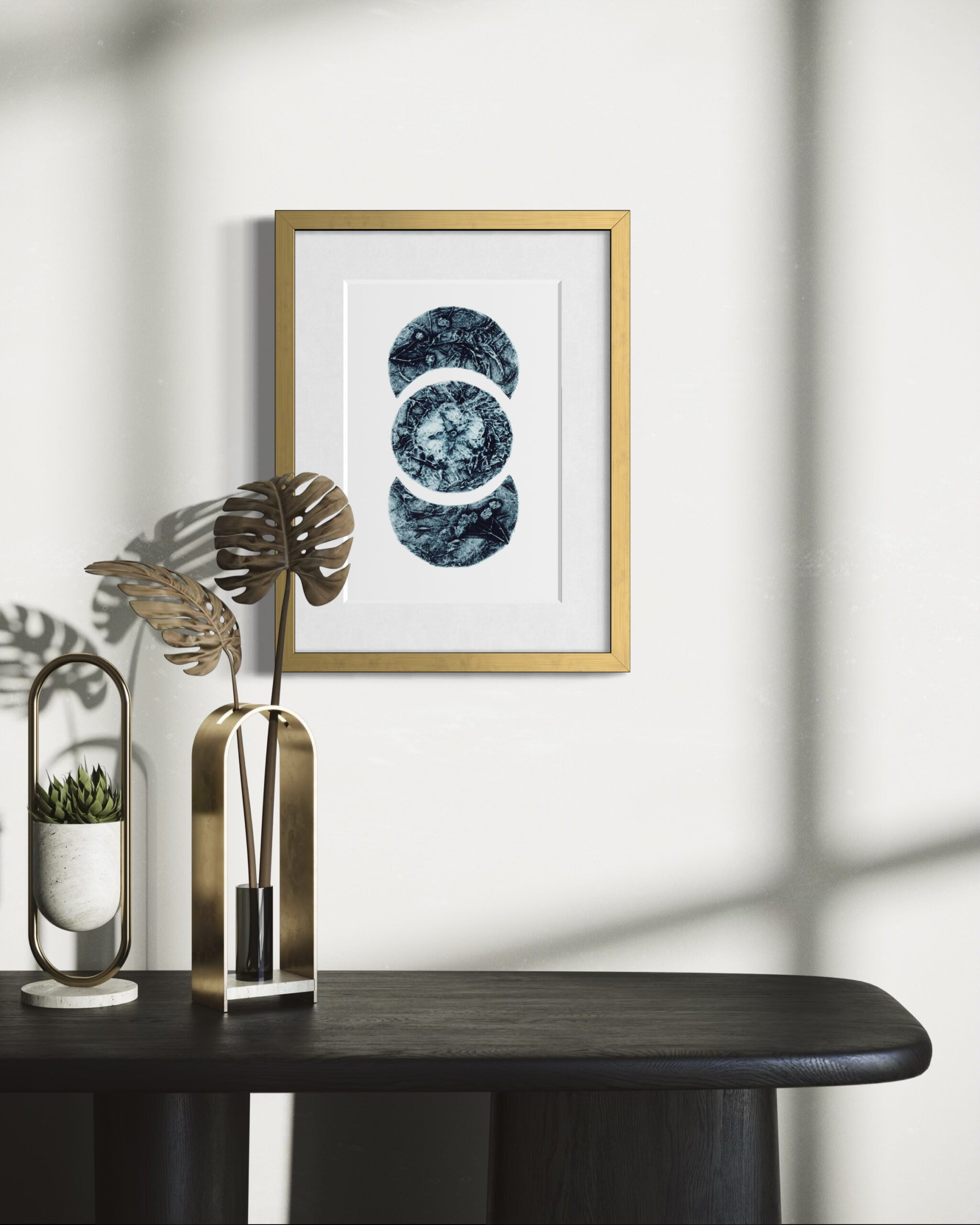 This collagraph monoprint is 1/3 in a variable edition. Authenticity comes framed in a brushed brassy gold metal frame. Framed, the artwork measures 25.4 CM width by 33 CM high.