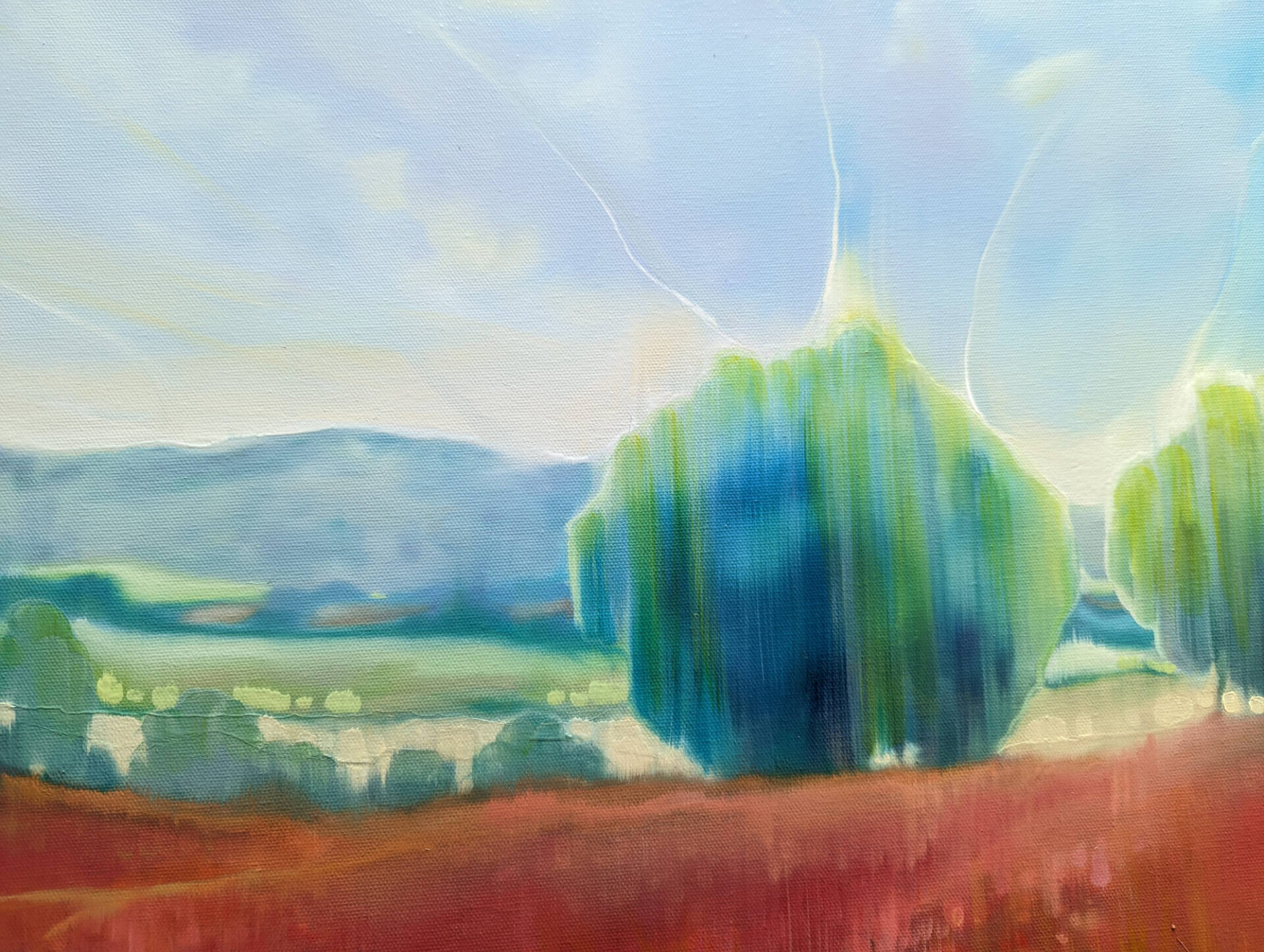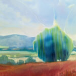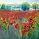 Beautiful England is an English countryside inspired landscape oil painting with pheasants and poppies in a summer meadow. It is 40x40x1.5 inches. The painting has a lot of energy to it although it is a peaceful scene and it catapults the viewer into the landscape by use of blurred edges and carefully placed lines and shapes. Two pheasants stand on the right surrounded by poppies. At the back of the meadow a path leads off into the next field and then towards the hills in the distance. It is contemporary semi-abstract and art nouveau in style. The pheasants are painted quite delicately and the poppies with thick, very bright red paint. The painting was inspired by a lovely sultry summer afternoon walk that I took near Selmeston village which sits to the north of the South Downs hills near Brighton. It sums up my absolute love of English landscapes especially in summer when the poppies come out in a mad contrast to the greens of the hills and fields and trees. Painted on deep edge canvas, edges white, no frame necessary, ready to hang and comes with a certificate of authenticity.