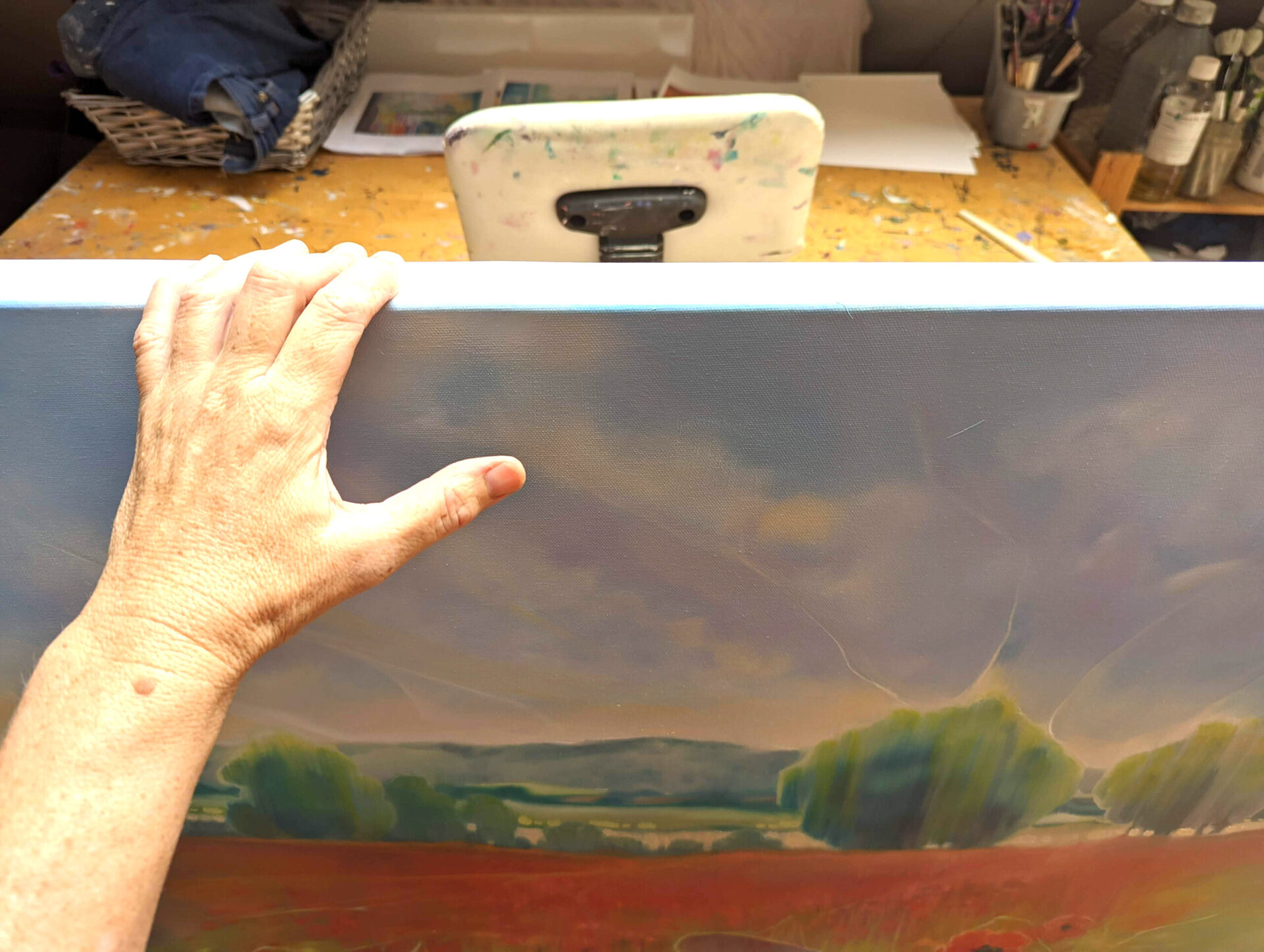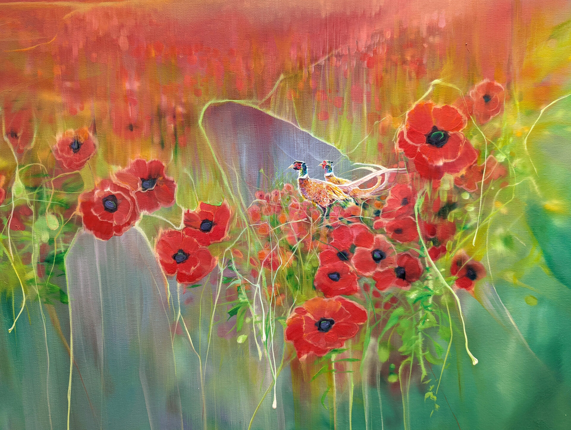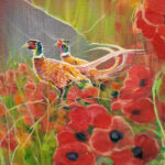Beautiful England is an English countryside inspired landscape oil painting with pheasants and poppies in a summer meadow. It is 40x40x1.5 inches.