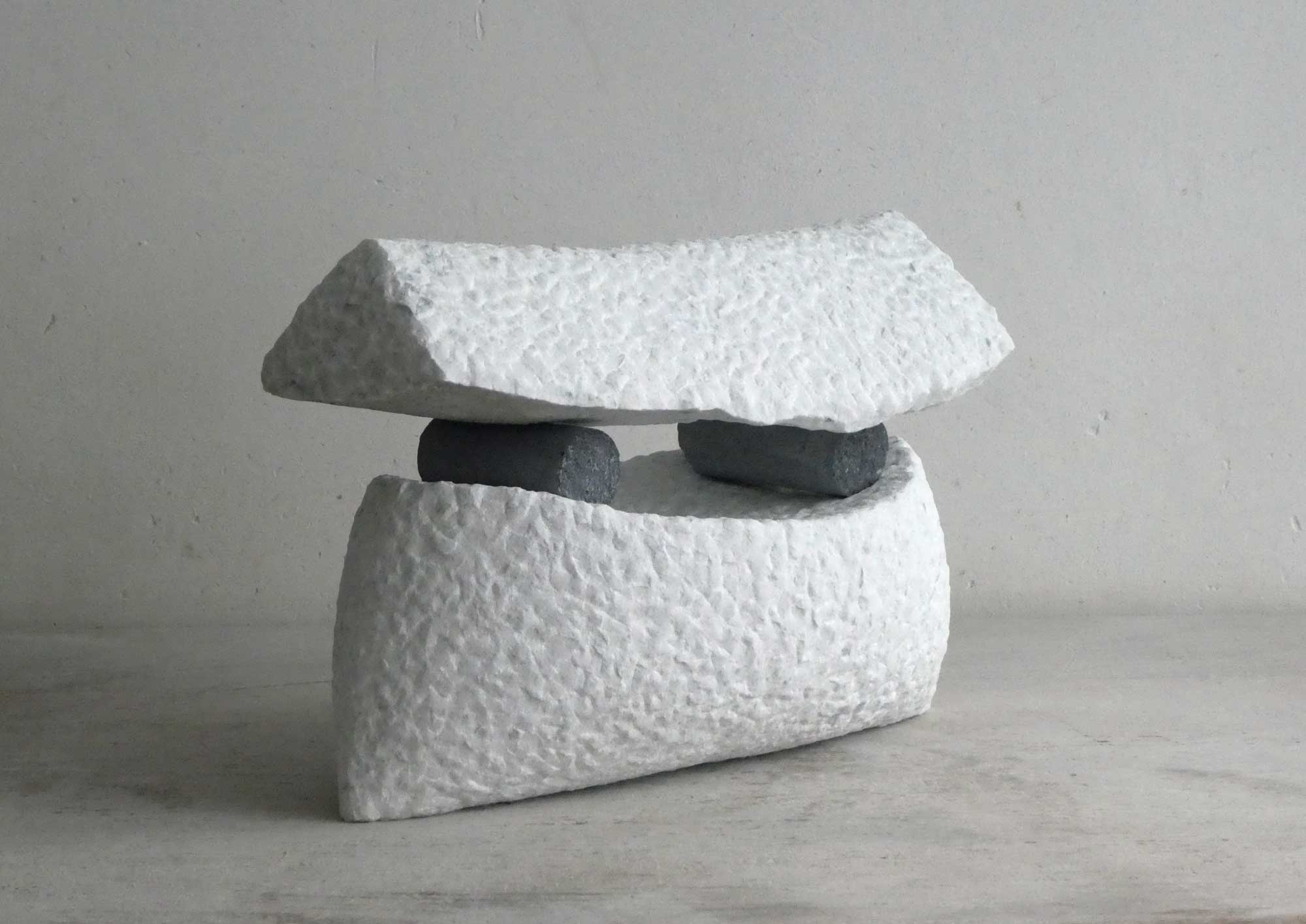 This sculpture is made of two different materials: white marble, and grey bluestone. The upper part rest loosly on the bluestone rollers.