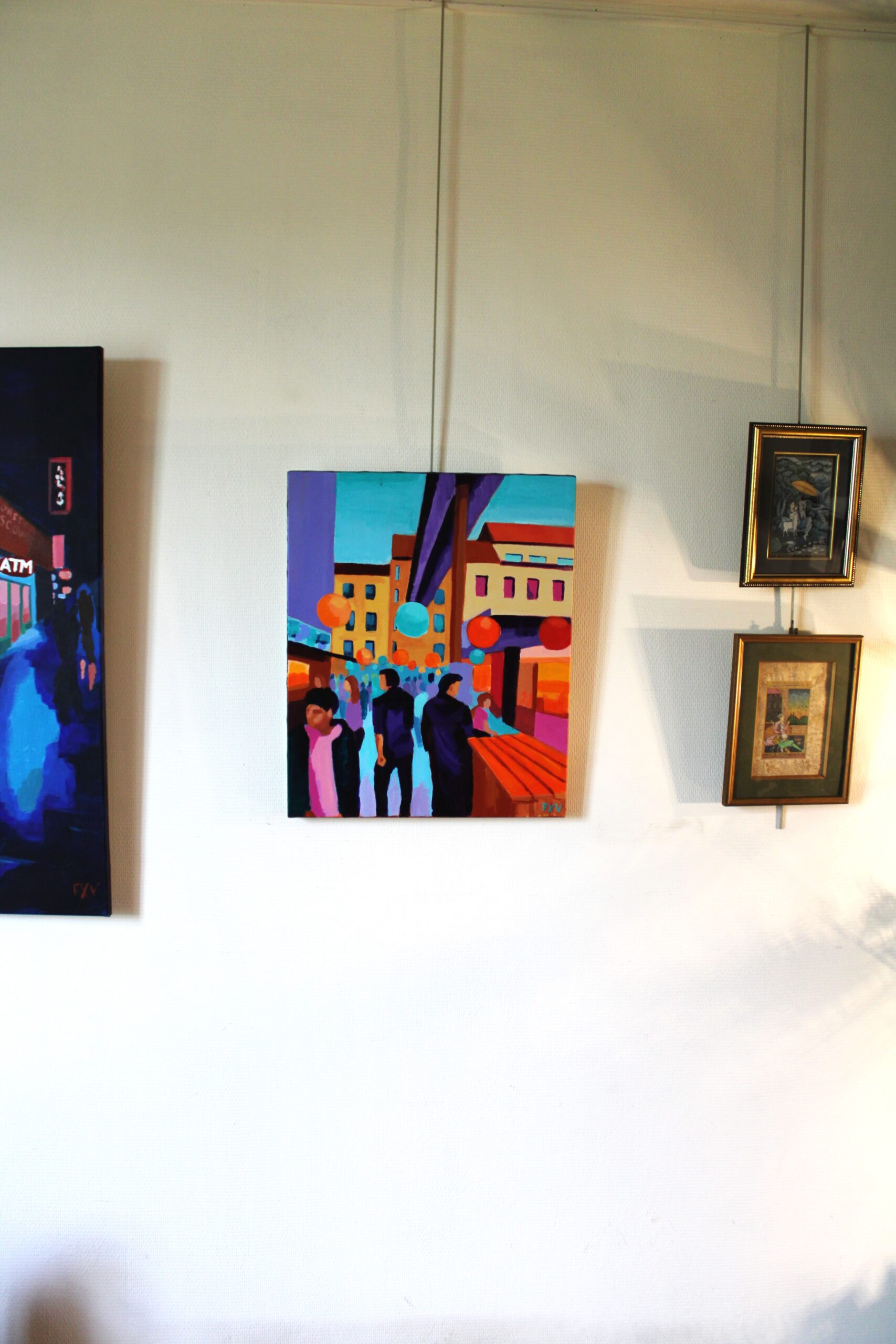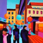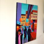 The artist’s style seems to draw from elements of expressionism, with a focus on conveying emotion and atmosphere rather than precise details. This approach effectively captures the essence of a ruin bar, known for their eclectic decor and vibrant social scene. The painting beautifully encapsulates the spirit of Budapest’s nightlife, making it a dynamic and engaging piece.