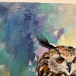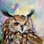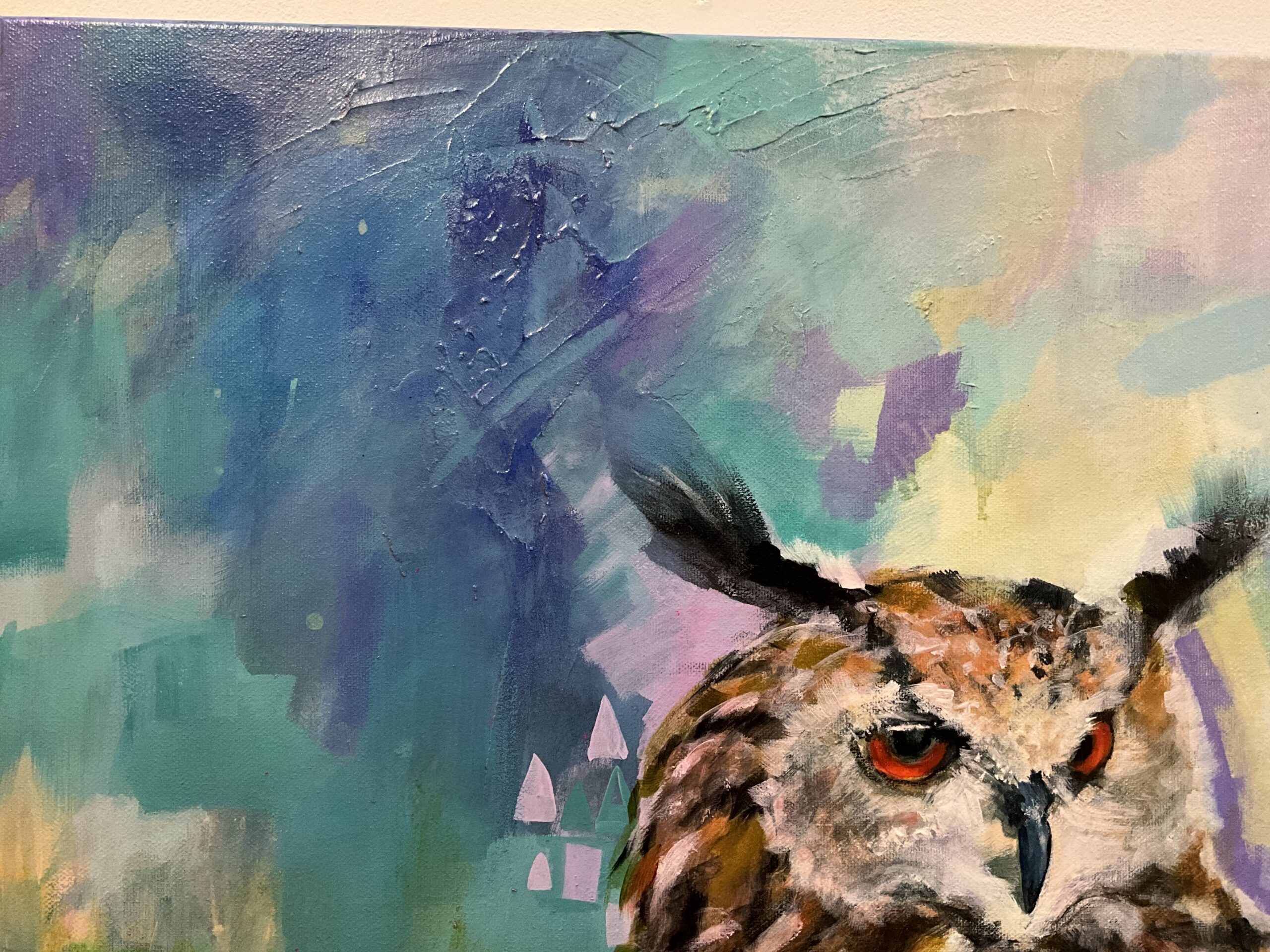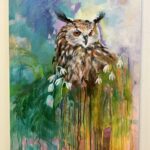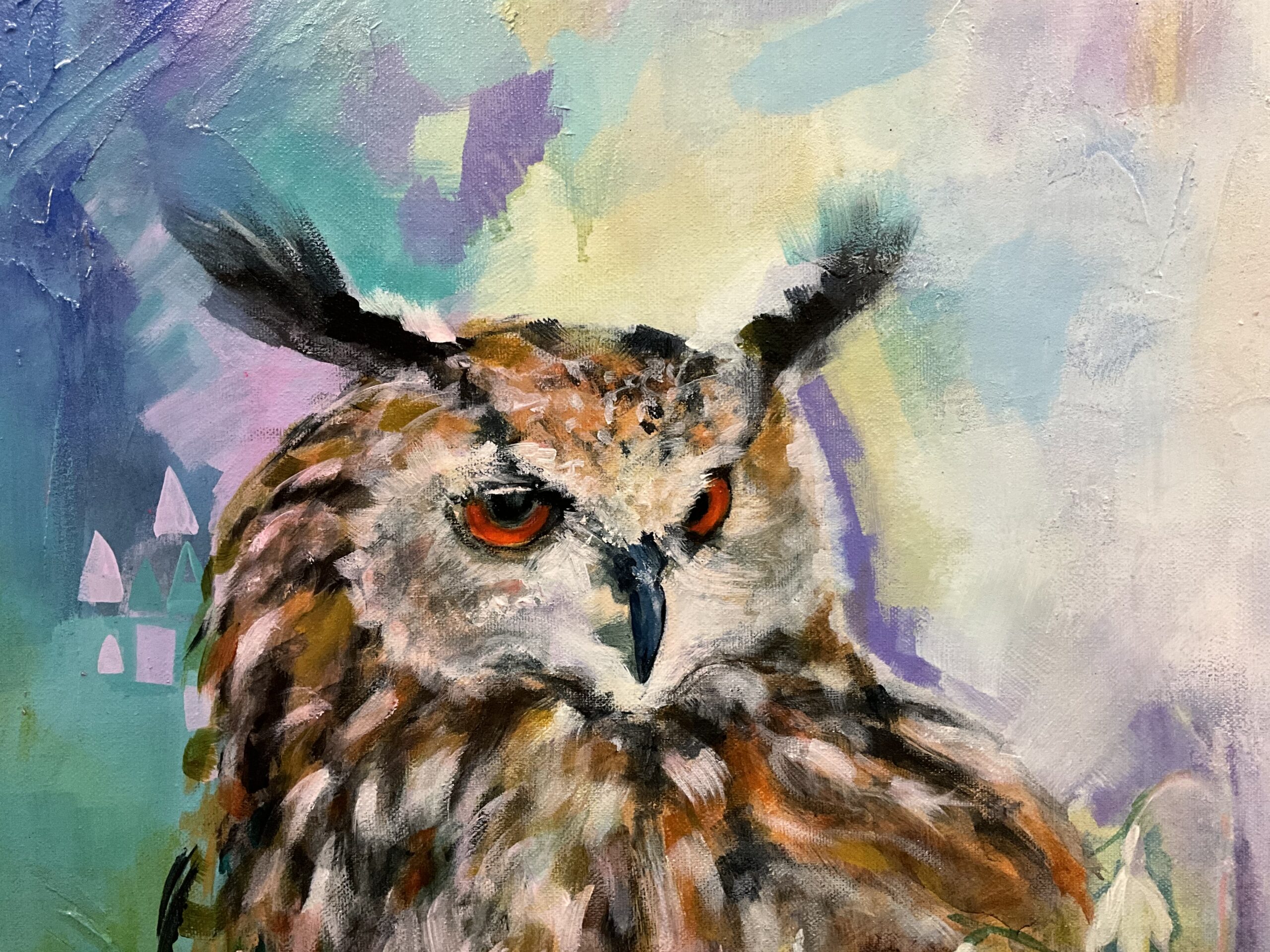 A dreamy semi abstracted portrait of an eagle owl. Colourfully painted in acrylics on box canvas. Satin varnished. Striking and evocative, with a magical feel.
