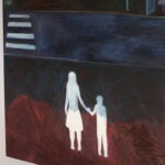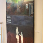 The asphalt sign with the white mother and child in the painting encourages you to take an outing across the city. Life in the city remains the same regardless of how big or tiny the city is.