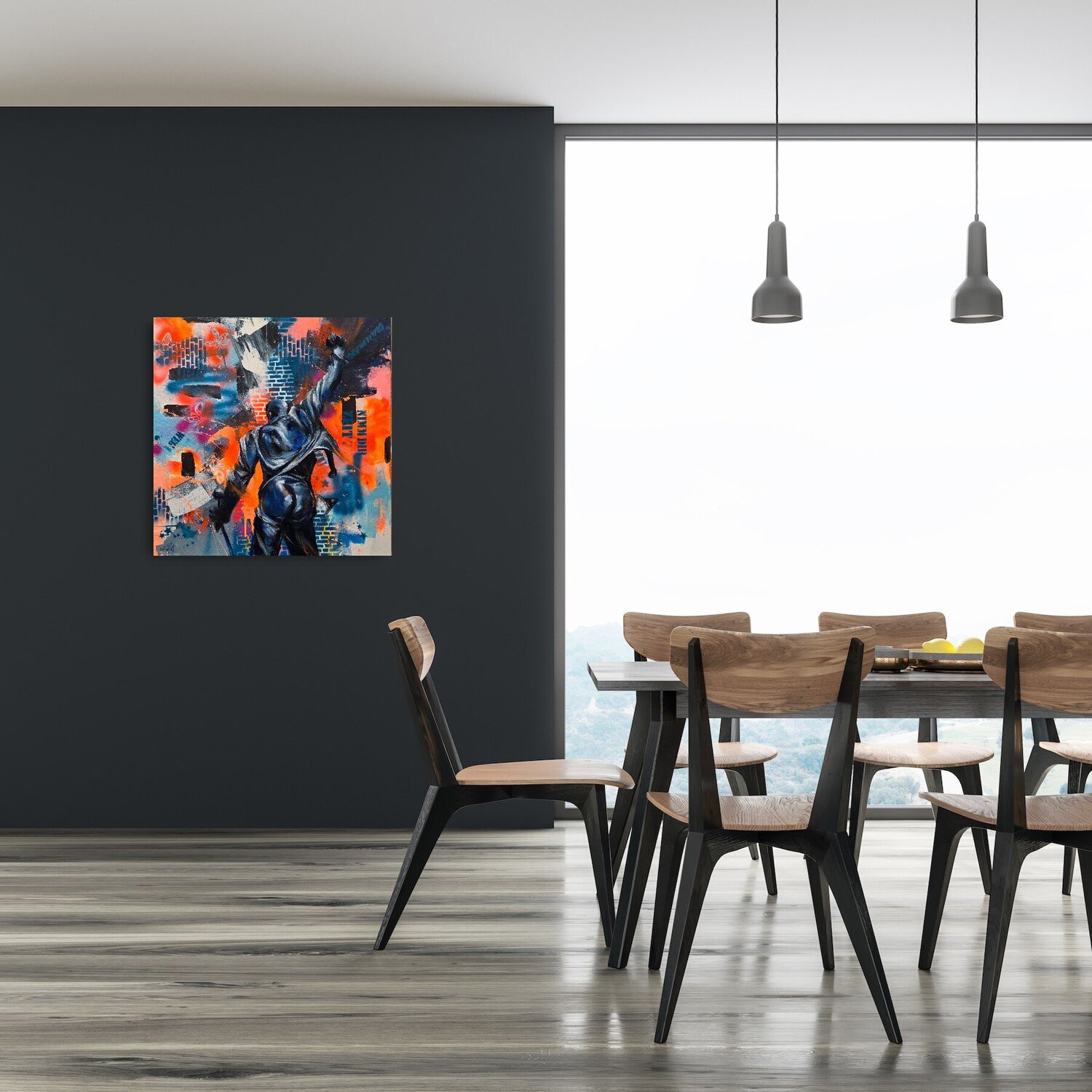 Die kräftigen Farben und der dynamische Stil spiegeln den ungezähmten Geist von Freddie Mercury,