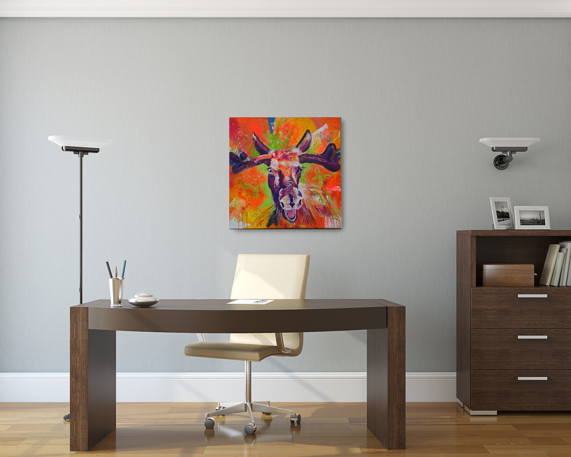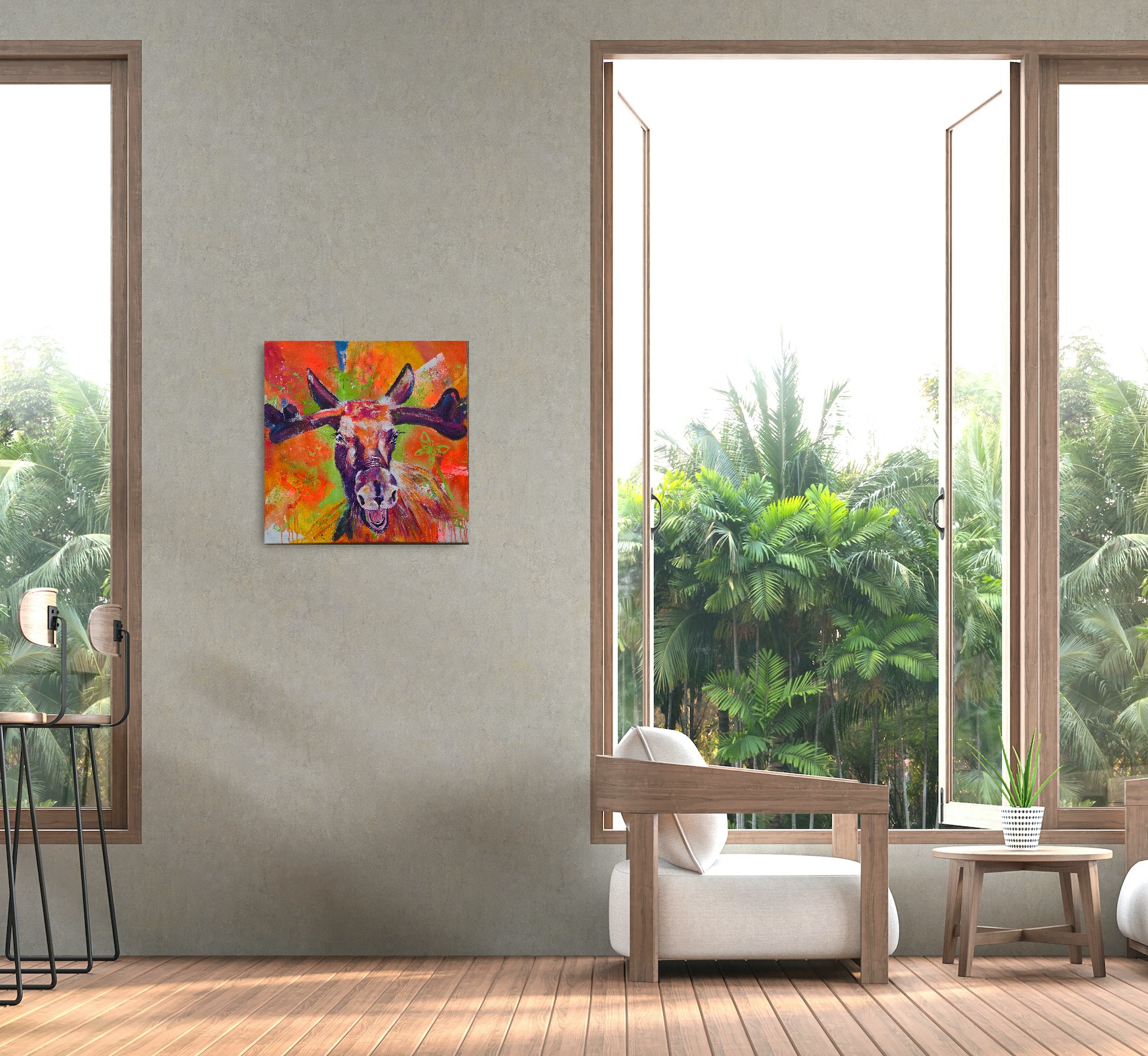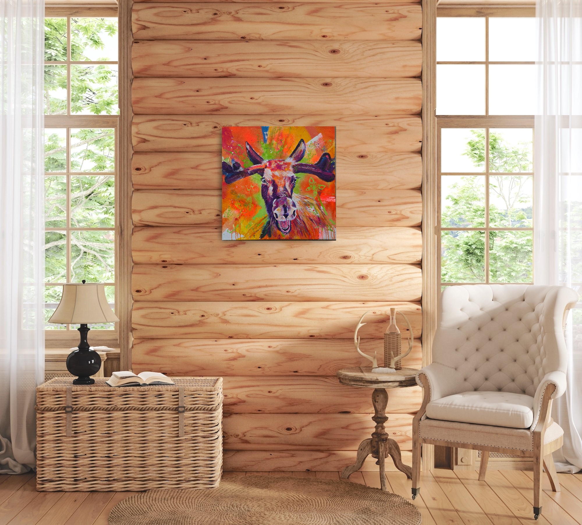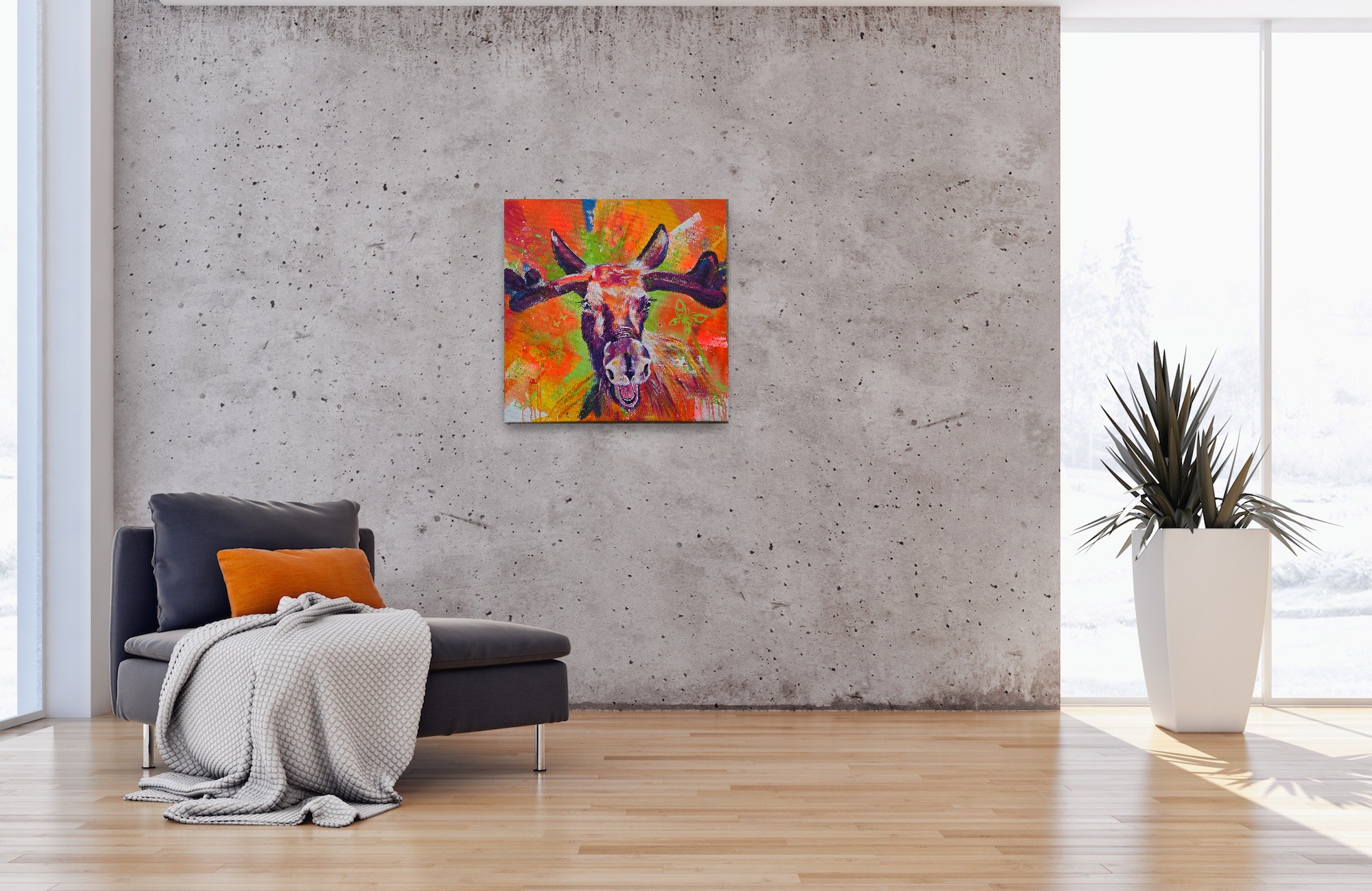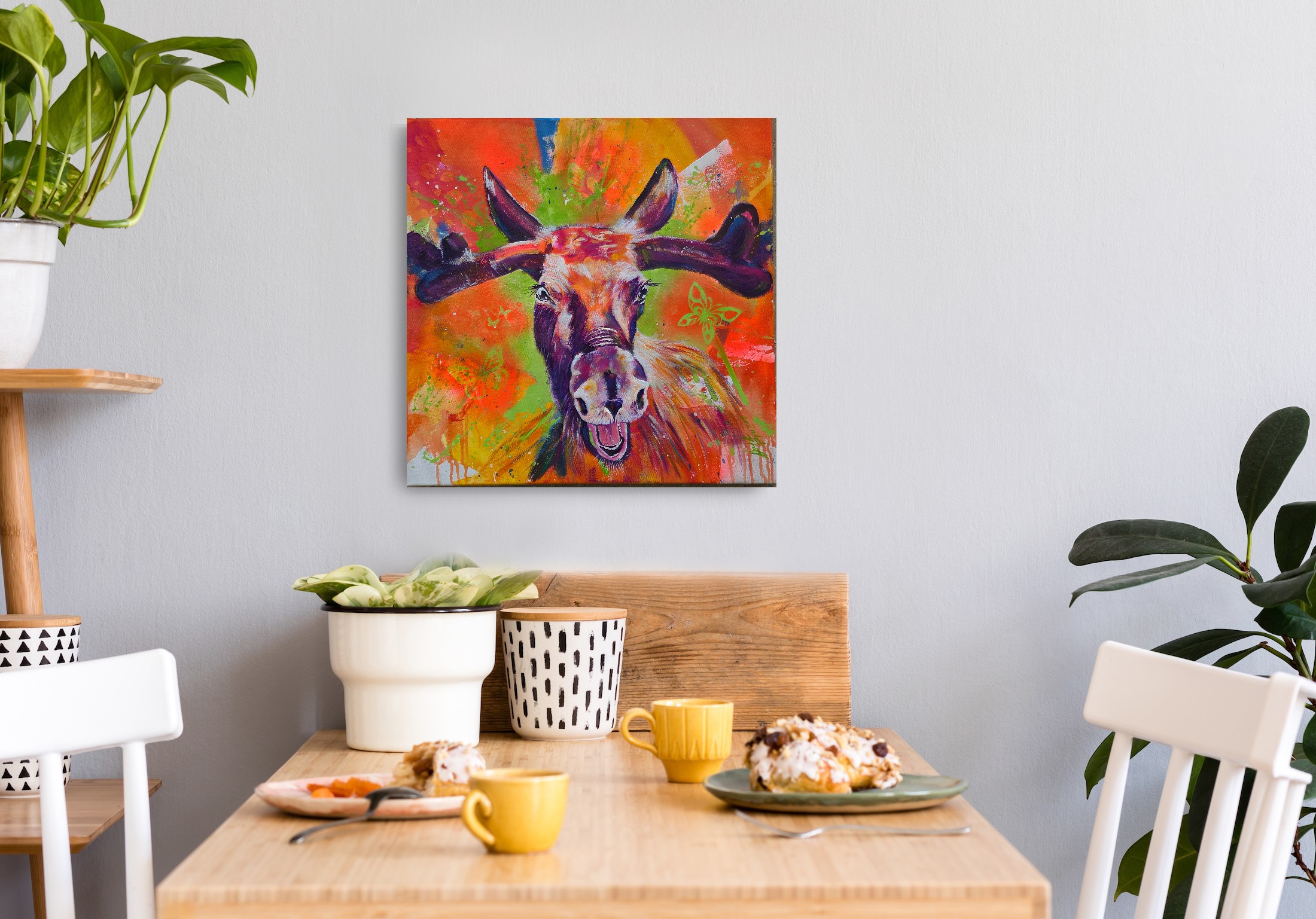 Ich habe diesen lächelnden Elch mit leuchtenden Acryl- und Sprühfarben zum Leben erweckt,