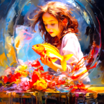 Greg Stirling’s “Girl with Goldfish Collection” is a whimsical and enchanting series that transports viewers into a serene, fantastical realm. The collection features a young girl in a world where the usual constraints of reality are lifted, allowing goldfish to swim gracefully through the air. This surreal element serves as a metaphor for a life unbound by the harsh realities of adulthood and the outside world, encapsulating the innocence and wonder of a child’s imagination.