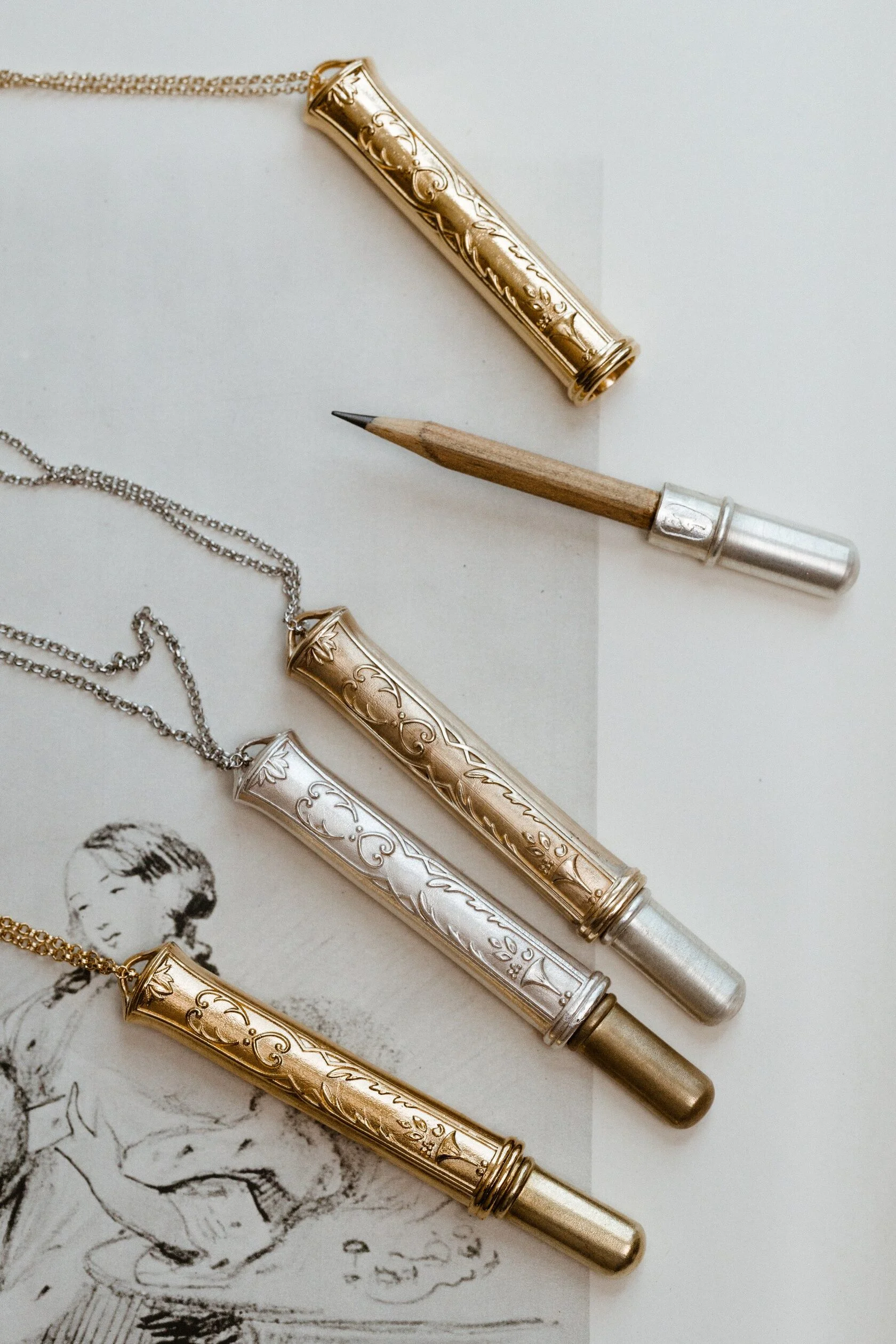 Gold-plated pencil pendant with a real pencil inside