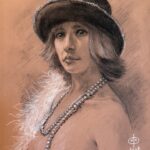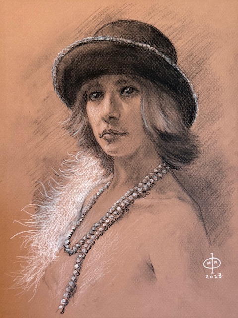 “Harle in Hat and Pearls”, charcoal and pastel on Canson paper, 2023, 30.5 cm x 38.7 cm / 12″ x 19.5″ (framed)