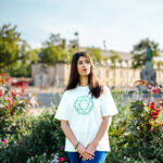 Green Heart Chakra symbol embroidered in biodegradable Tencel threads on the middle front.
