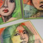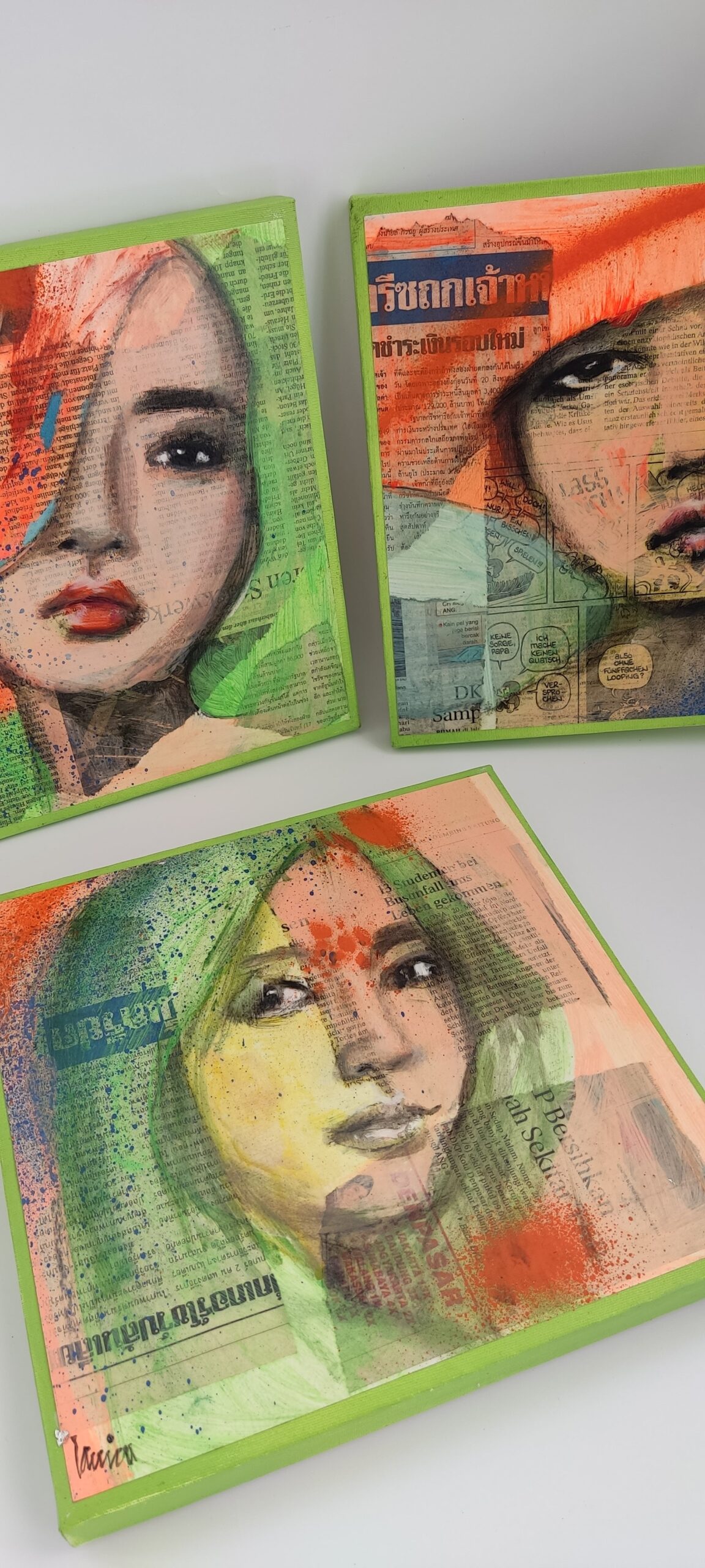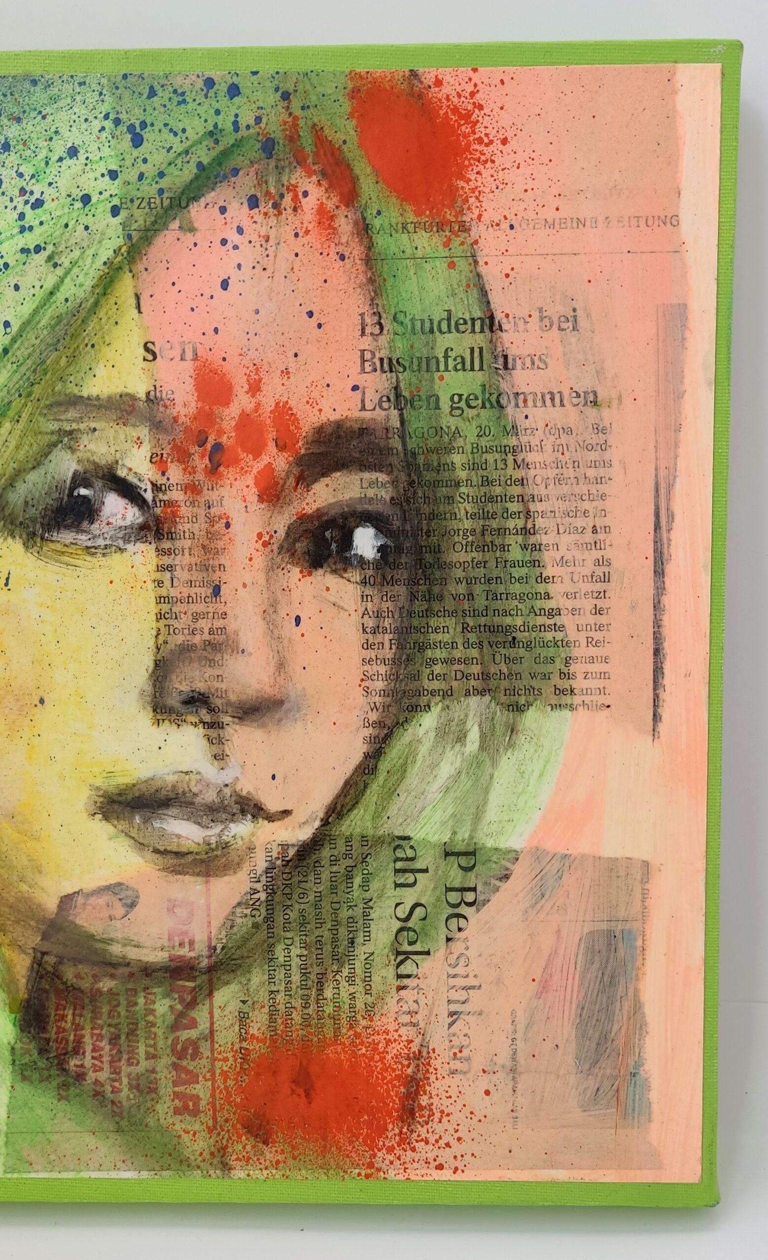The face is painted in oil, over a foundation of news paper collage. There are different languages (German and Hindu), scripts even, that depict the rich background and the different layers that make up the landscape of life.