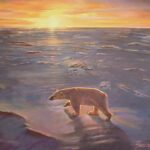 A sole polar bear wanders across the desolate ice landscape of the North Pole in search of food