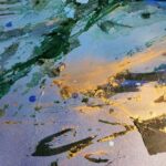 It has been painted with acrylics and spray paint. Some of the paints have a metallic glare and can all of a sudden light up, depending on the angle of the light source and your position. There is also gold in this painting, seen in different manners from different perspectives