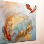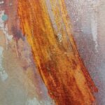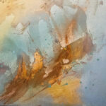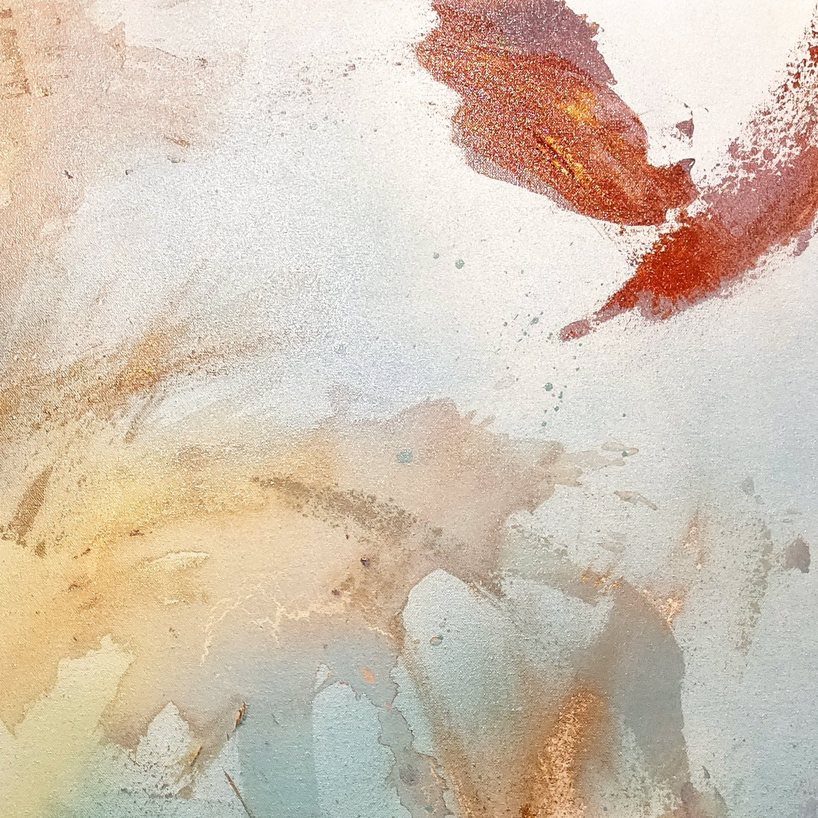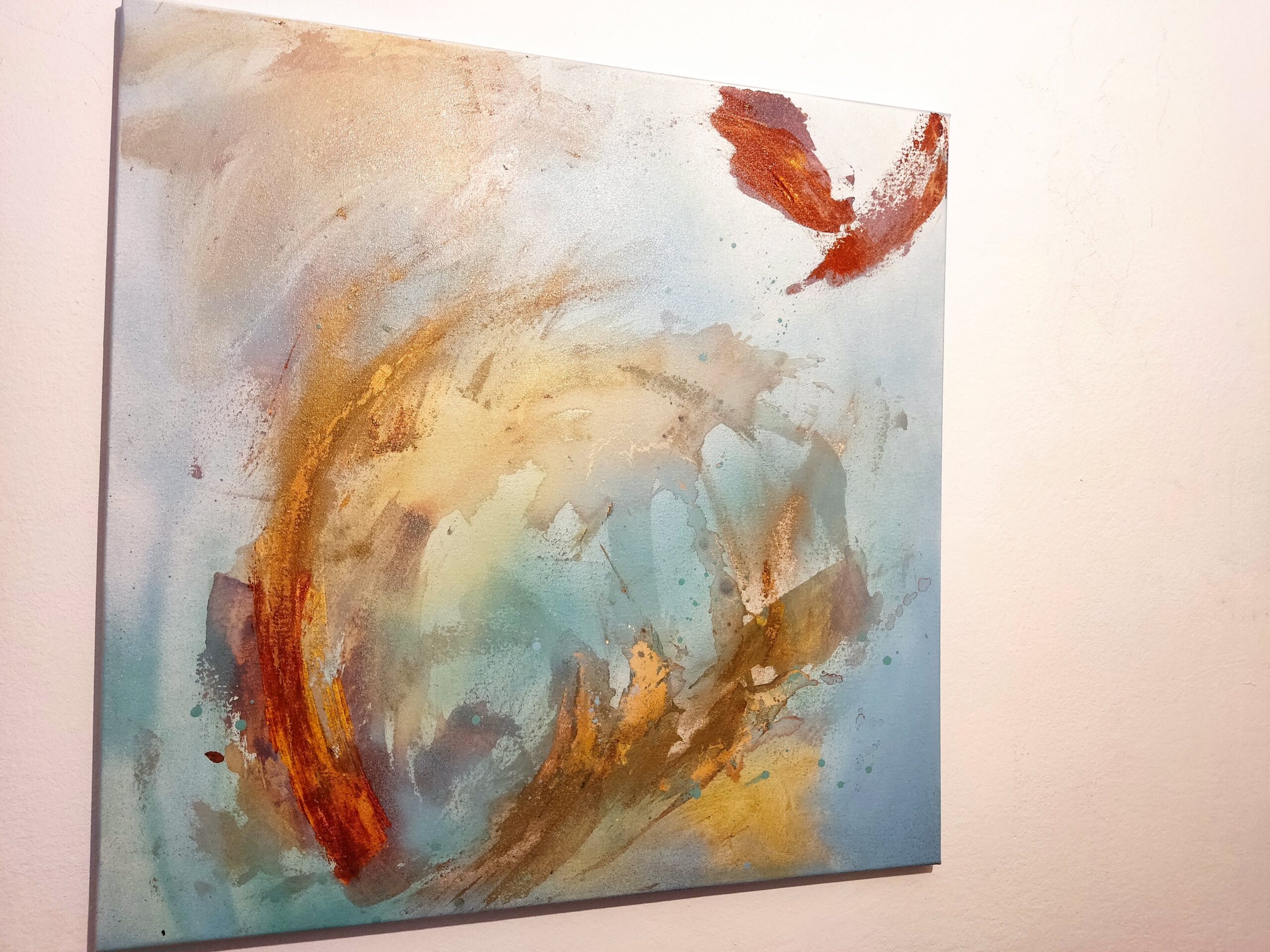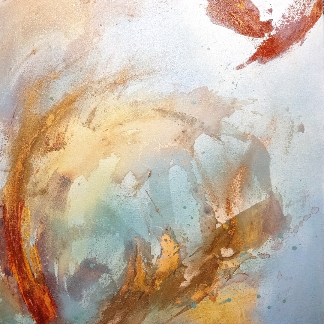 This painting is abstract. Which means that you need not define it. Within the privacy of our heads we can make up any story, in which the golds and blues, the many layers, the different textures, movements and glittering paints all play a role. But i will not steal your opportunity to dance with this image, to dive into its depths and have your own very personal experience.