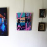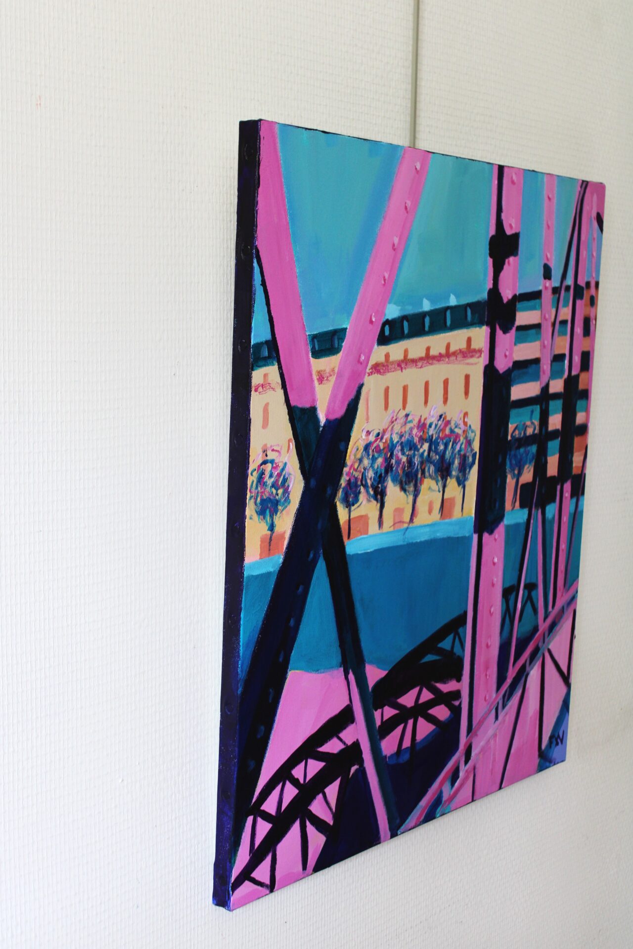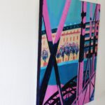 This painting, inspired by David Hockney’s style and based on a photo taken on the Jim Morrison footbridge in Paris, captures the artist’s vibrant and dynamic essence. The use of bright colors, particularly shades of pink and blue, is reminiscent of Hockney’s bold palettes. The black shadows cast by the bridge’s metal structure add depth and contrast to the composition.