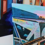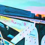 This painting captures the Jim Morrison footbridge in Paris during spring, featuring a metal structure in the foreground adorned with colorful graffiti. Blue and green tones dominate, contrasting with hints of pink and orange. The footbridge and trains in the background evoke a dynamic and lively urban landscape. The graffiti adds a personal and artistic touch, reflecting urban expression and culture, creating a vibrant and contemporary atmosphere.