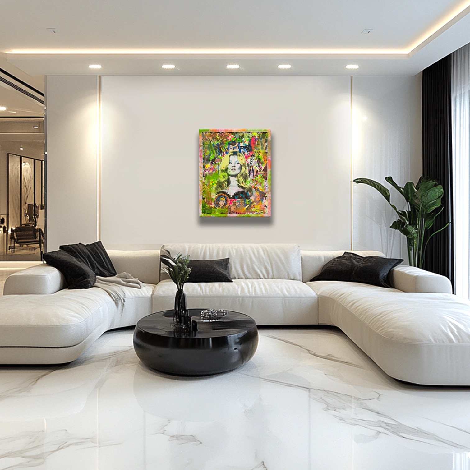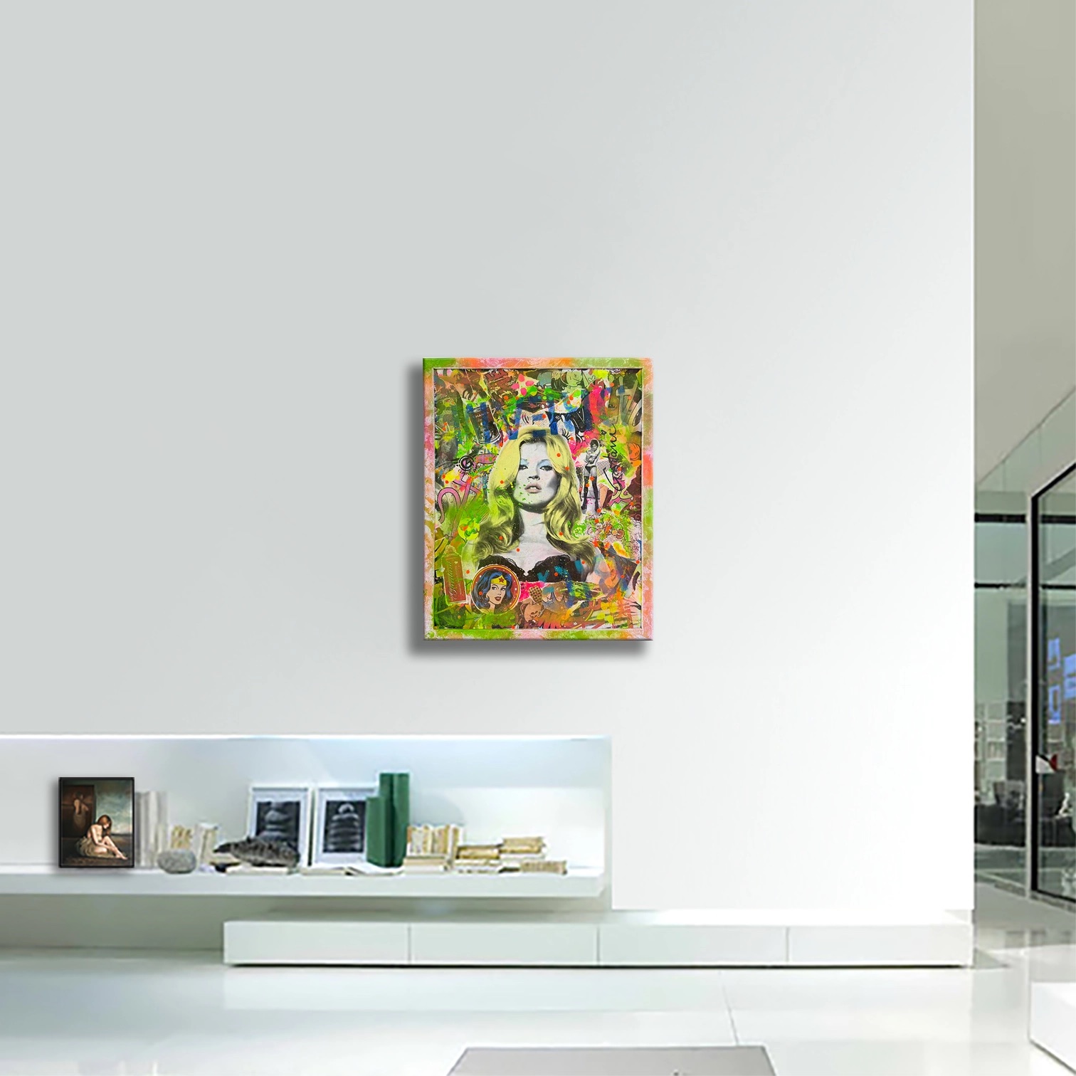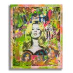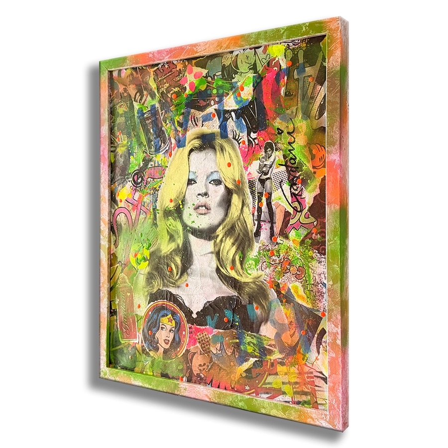 Kate Echoes represents a sophisticated mixed-media exploration of contemporary iconography. Gardani combines painting, collage, and screenprint techniques to construct a layered portrait that transcends traditional portraiture.