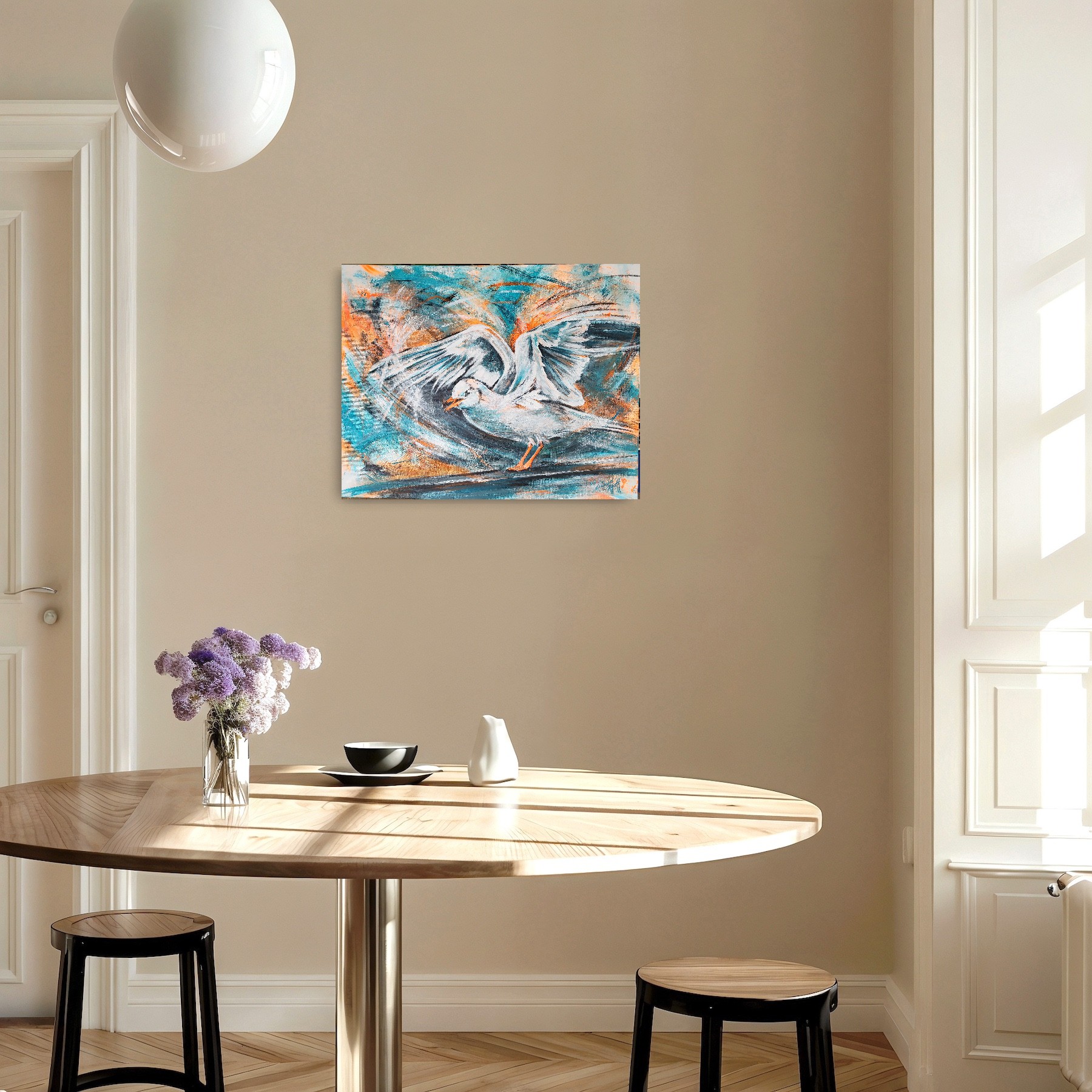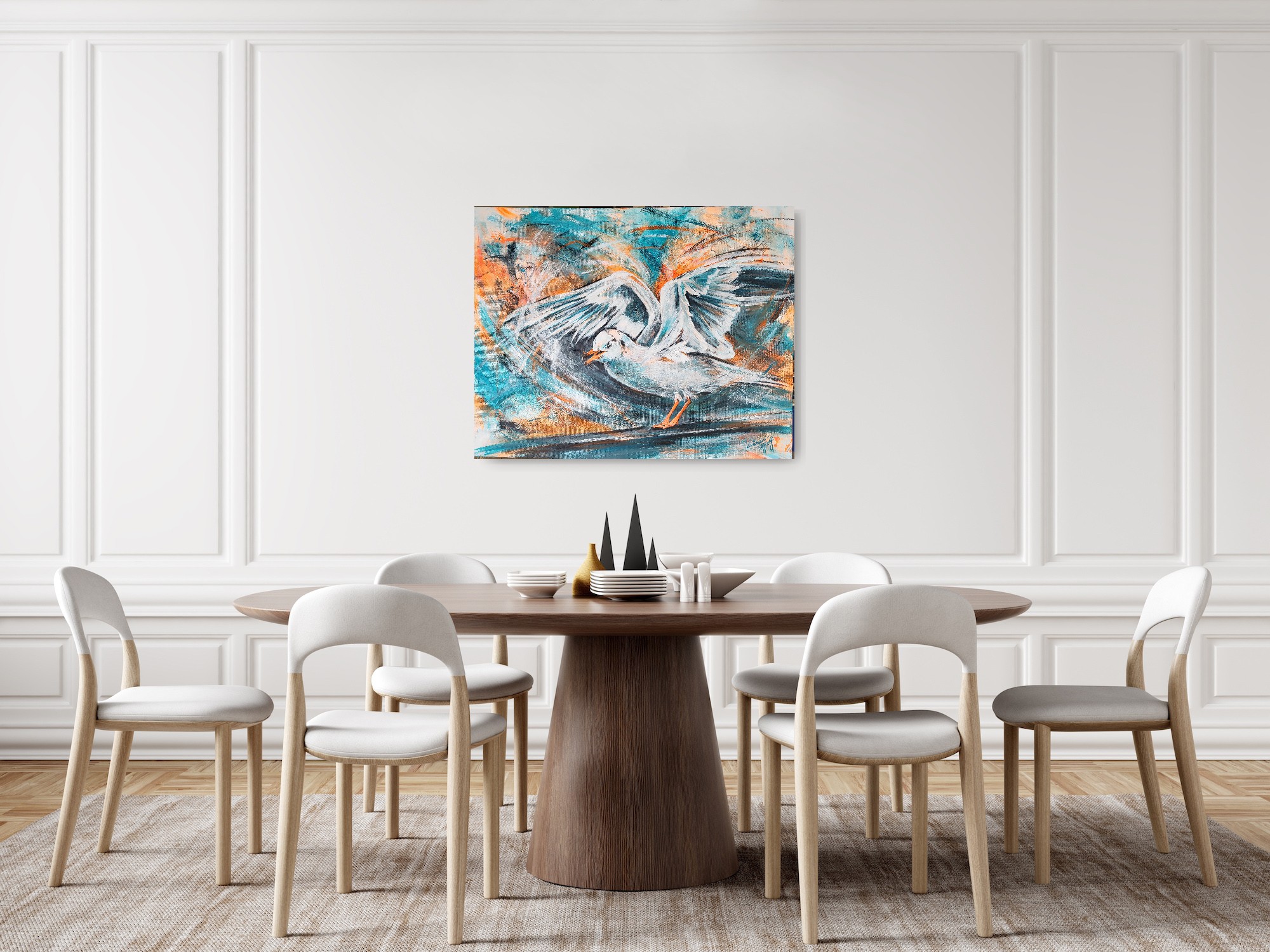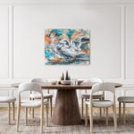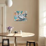In meinen Arbeiten verschmelzen Acrylfarben, Neonfarben, Kohle und Seidenpapier zu einem lebendigen Spiel von Abstraktion und Realismus. Die Möwe, Symbol für Freiheit und Weite, ist in dynamischen Farben und energischen Pinselstrichen eingefangen, die die pulsierende Kraft der Natur widerspiegeln. Dieses Gemälde strahlt eine unvergleichliche Vitalität aus, die jeden Raum mit Lebensfreude und einem Hauch von Wildheit bereichert.