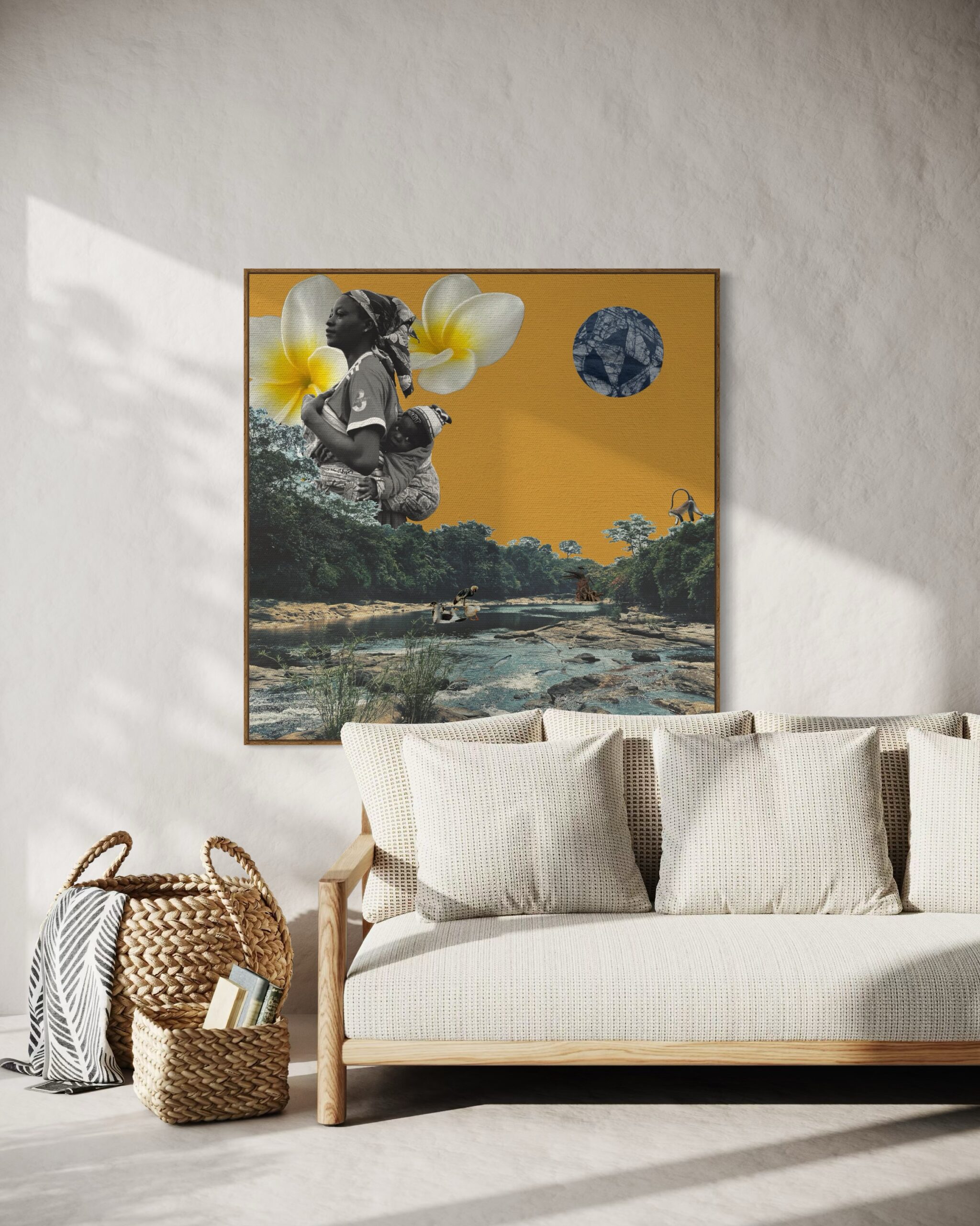 In honor of the Yoruba Orisha of feminity, abundance and nurturing, this collage depicts my idea of the different ways Osun impacts our daily lives. By being a conduit of vitality, she flows through our rivers, trees and animals, and passes that vitality to us for nourishment of our body and souls.