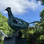 Bewerkt koper op houten sokkel. Hoogte incl, sokkel 155 cm