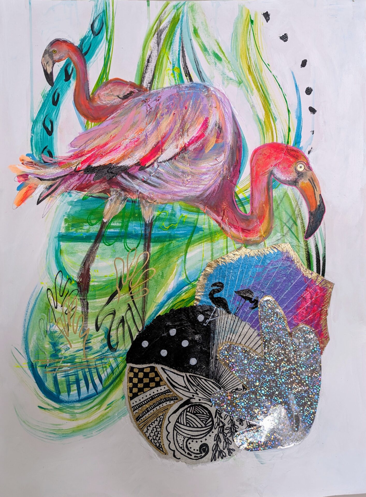Mixed media painting on paper 18″w x 24″h. Frame not included