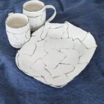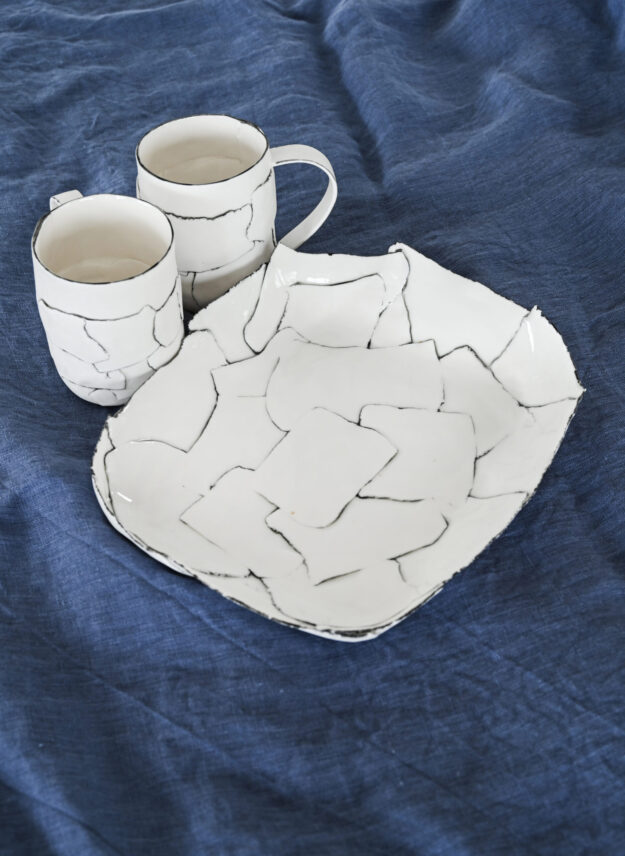 Chaque pièce est façonnée à la main, fruit d’un assemblage minutieux de languettes de porcelaine, qui lui confère sa forme et son caractère unique. La cuisson, parfois capricieuse, ajoute de légères variations. Les lignes blanches et noires se répondent, créant un équilibre subtil entre élégance et spontanéité.