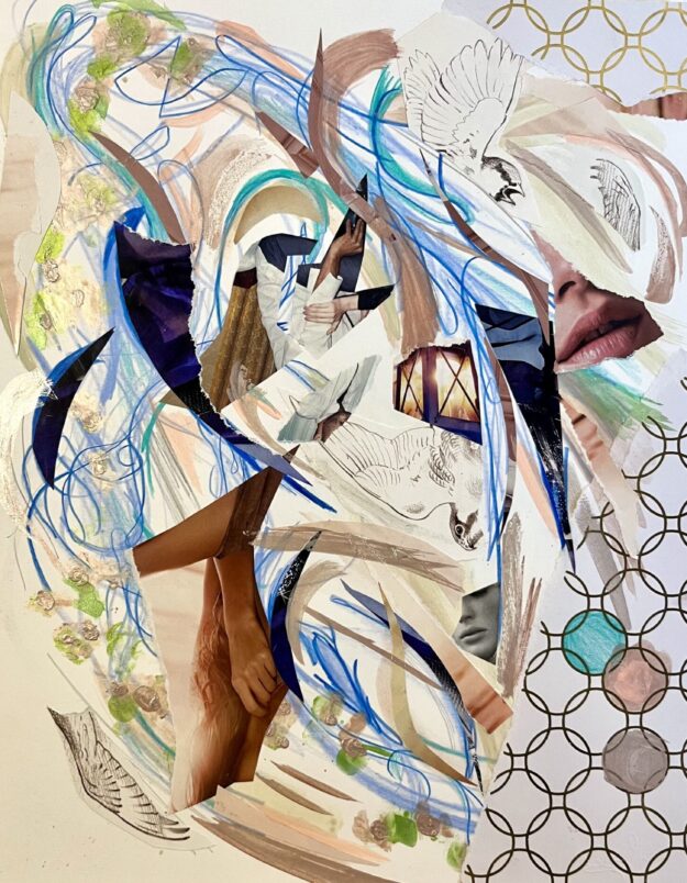 Mixed media collage on cardboard, created in 2023. Original artwork — unframed.