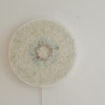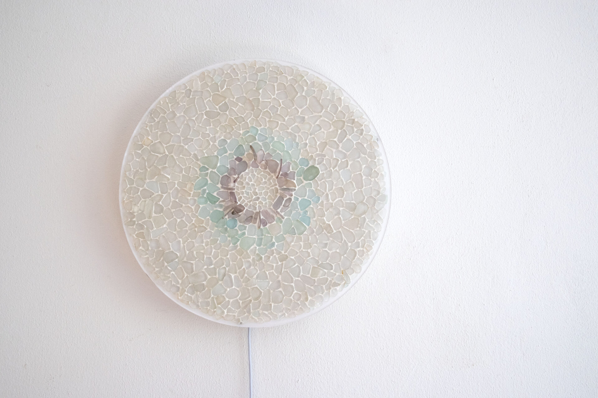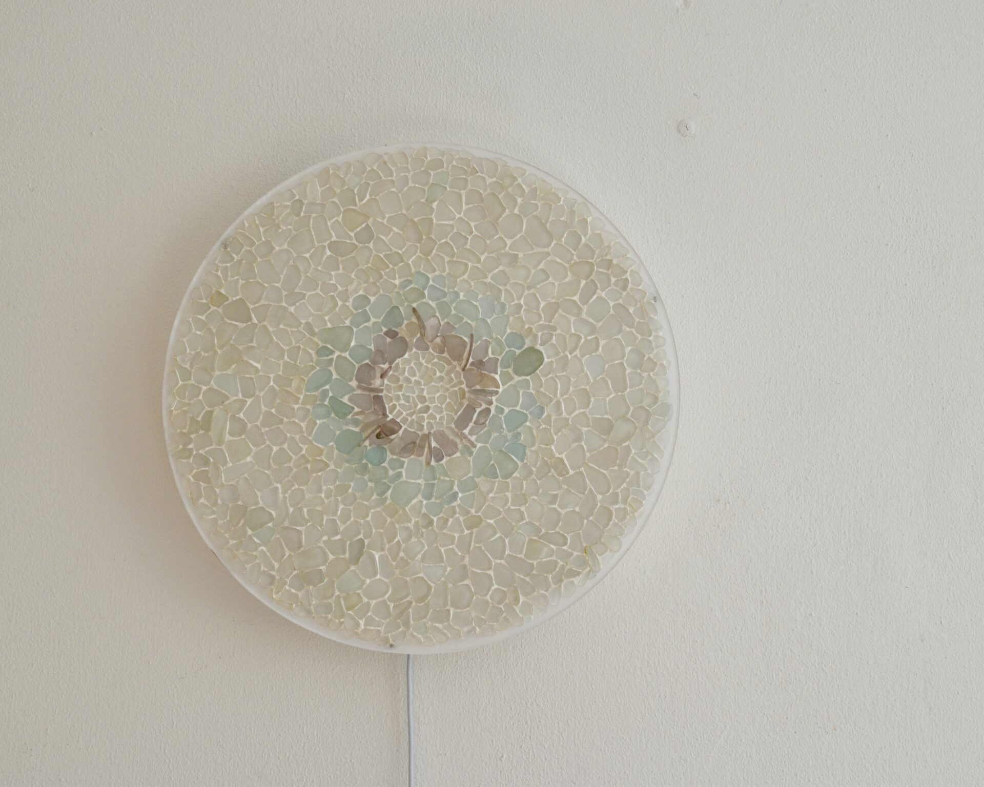 Ready to hang textured Sea Glass mosaic lighting measuring 45cm diameter. Remote controlled LED lighting with European electrical input.