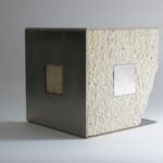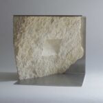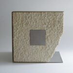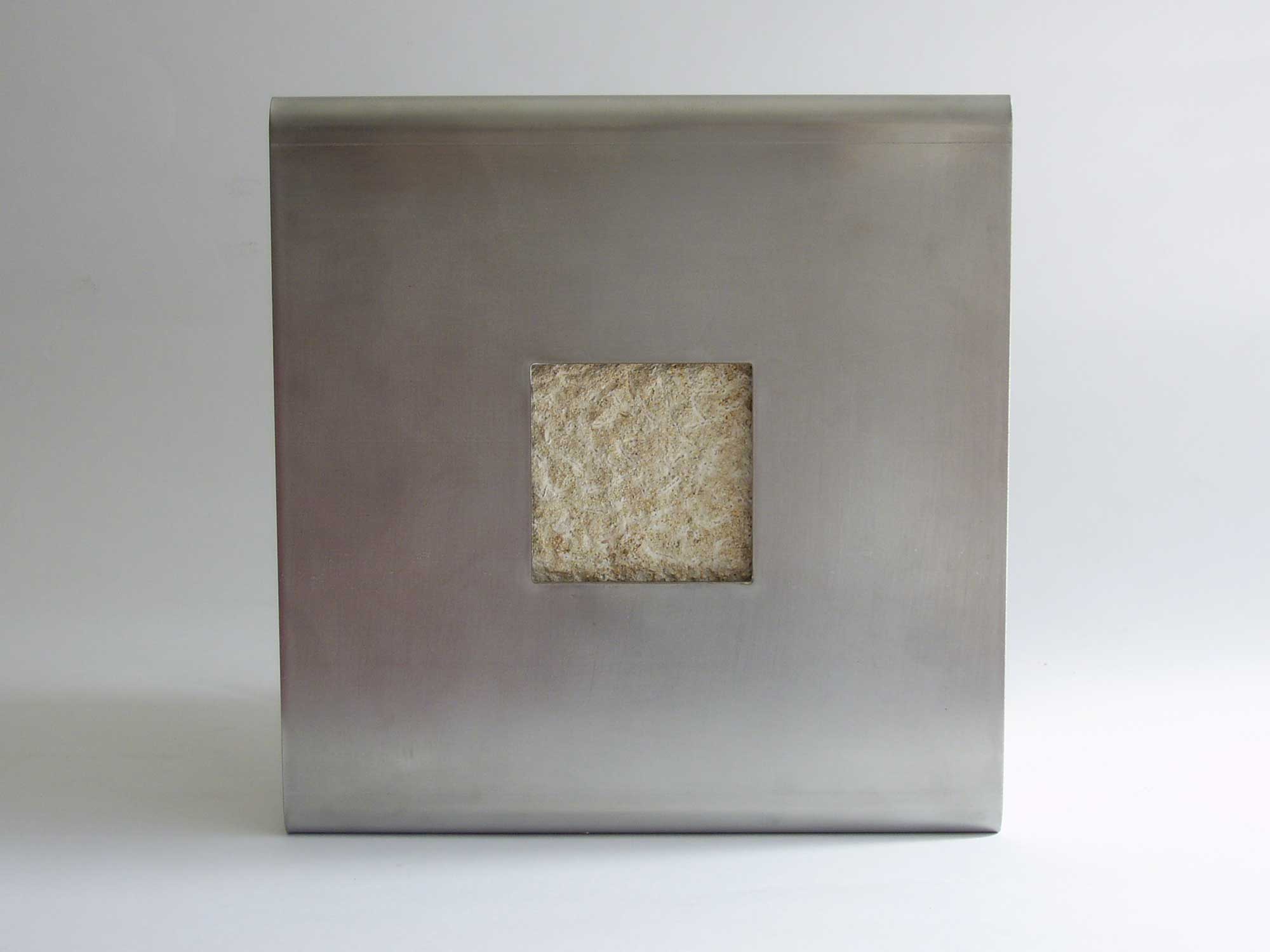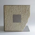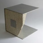 This piece of stone (German muschelkalk) was so beautifully broken, with all those little shells, I couldn’t pass it up. The stainless steel makes it into a square block again, a bit like putting a line / frame around it on paper. It’s playing with squares within squares. But also with the combination of the gray metal (stainless steel) and the soft earth color of the stone, smooth and rough.
