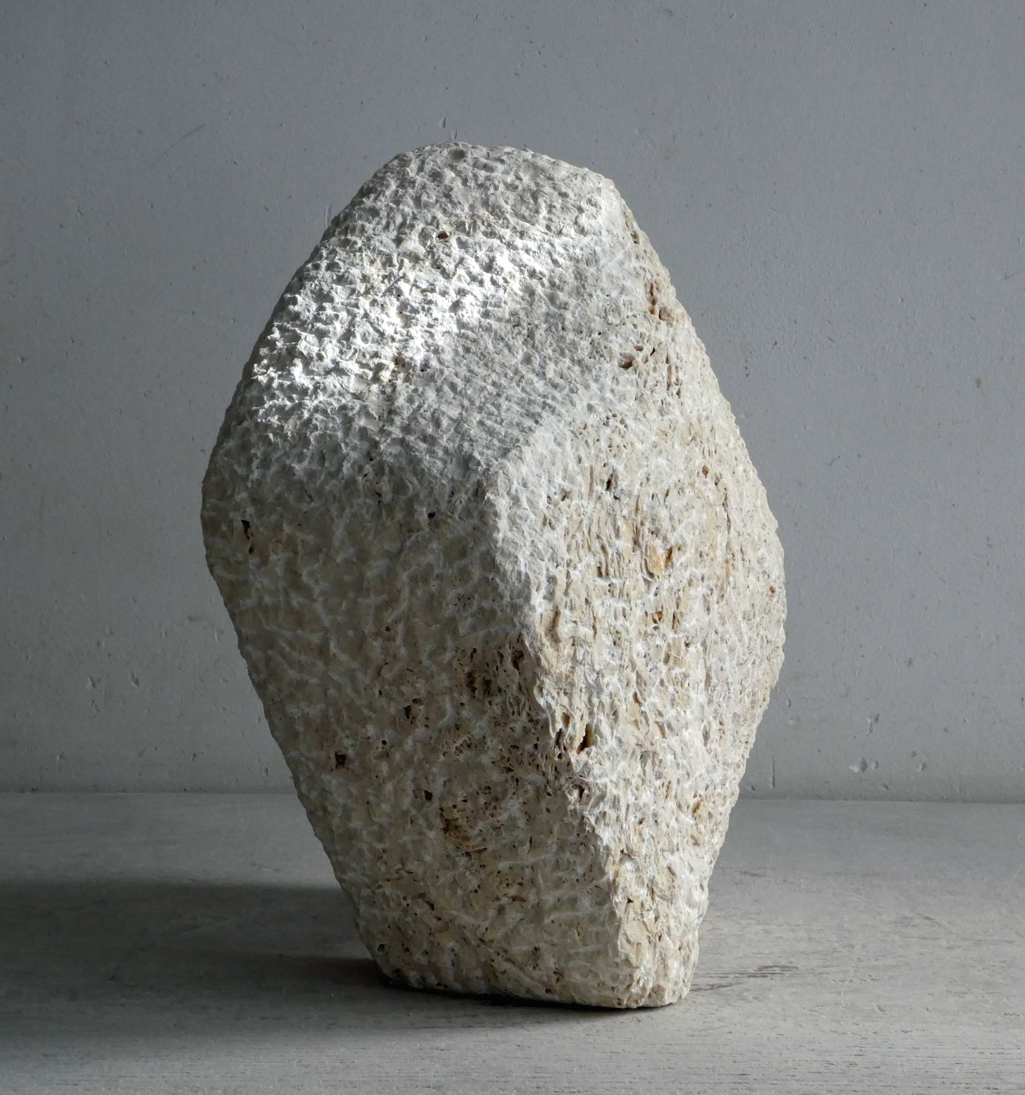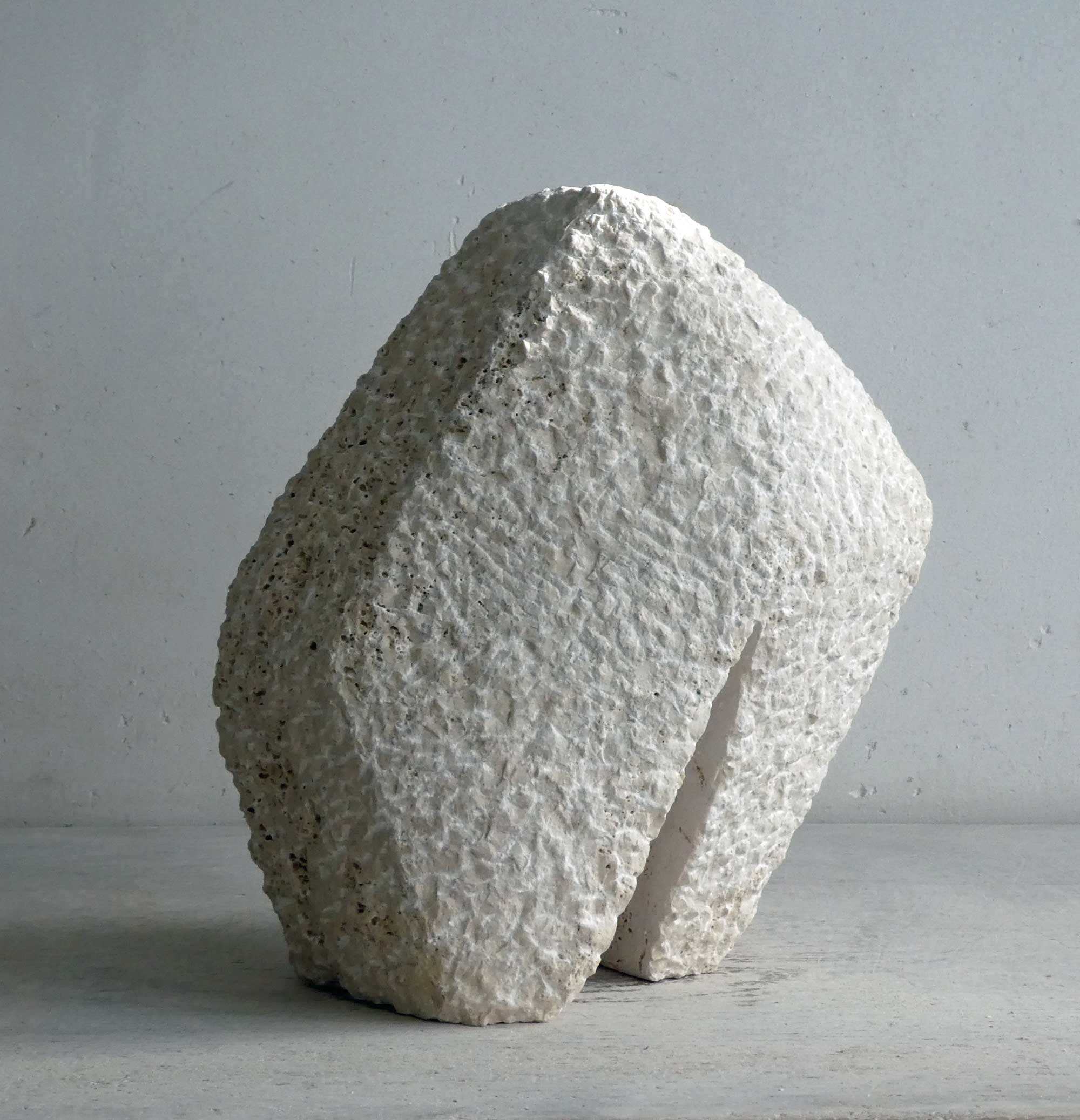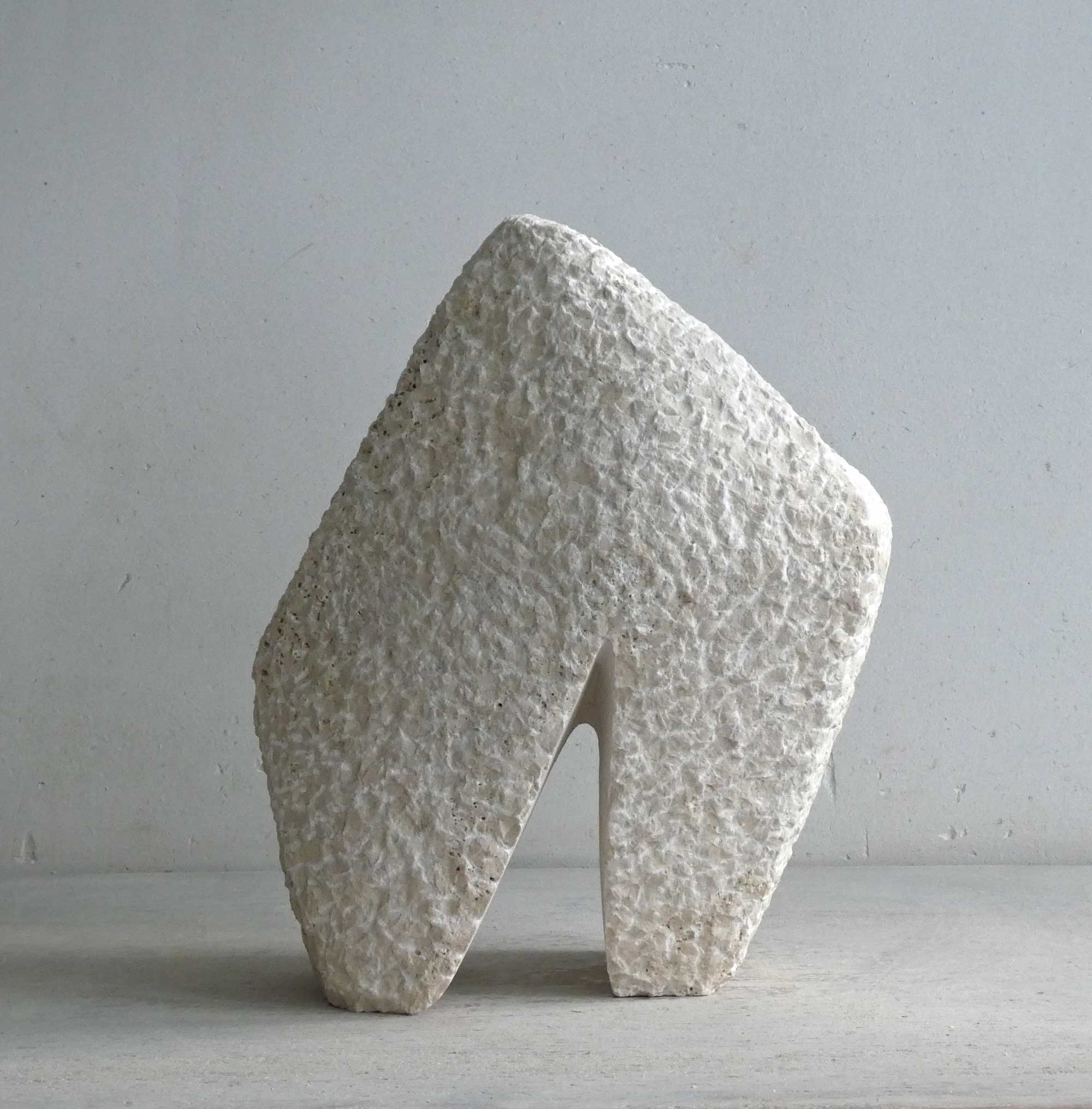 This sculpture started with a partially diagonally sawn piece of travertine that had been in my studio for years. Quite large in size (for me). An interesting stone, of natural colour, with a vivid expression.