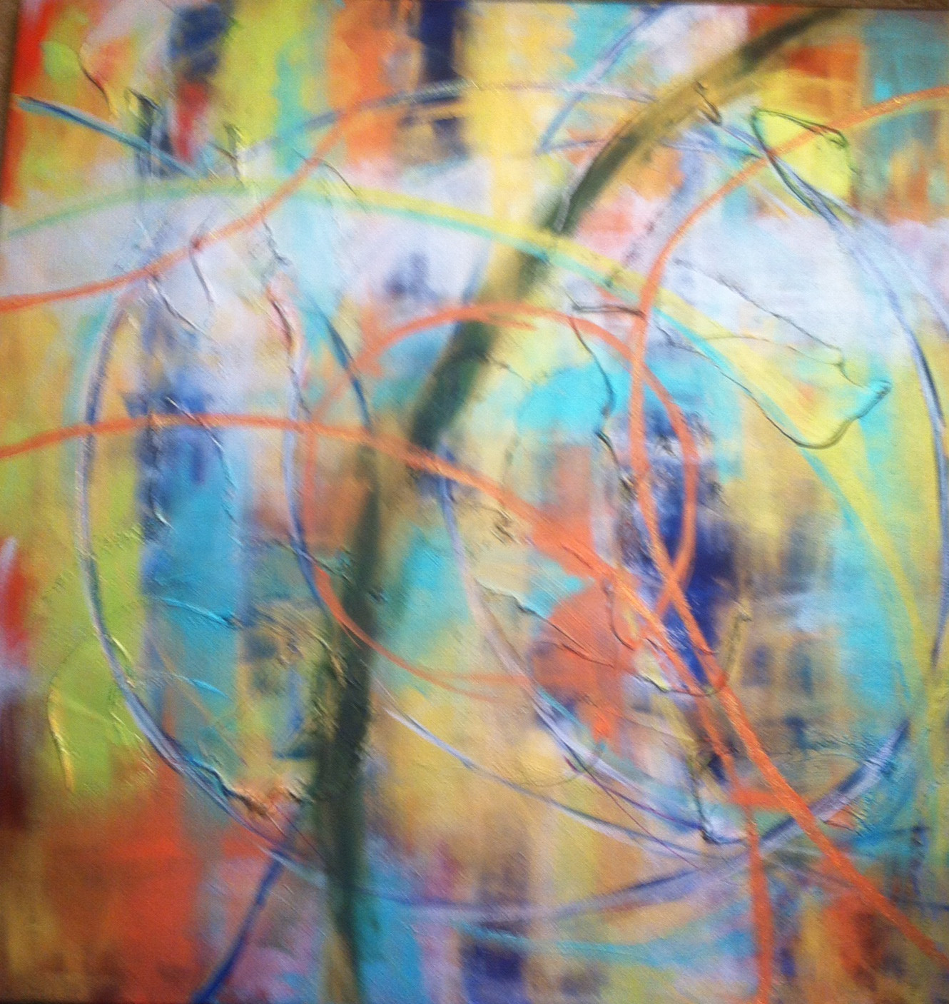 Summertime 2 Circle of Life, Acrylic with Texture, 30 x 30 inches, 76.2 x 76.2 cm, hung with Summertime 1 Circle of Life creating a diptych. Summertime colors, summertime energy, summertime feel even in the dead of winter.