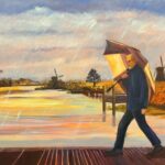 This painting was created from sketches and photographs following my visit to the Netherlands. I visited Kindersdijk on a day which quickly changed from sunshine to rain. The atmosphere was so moving and when drawing this view from the viewing café, a gentleman walked by and added to this composition.