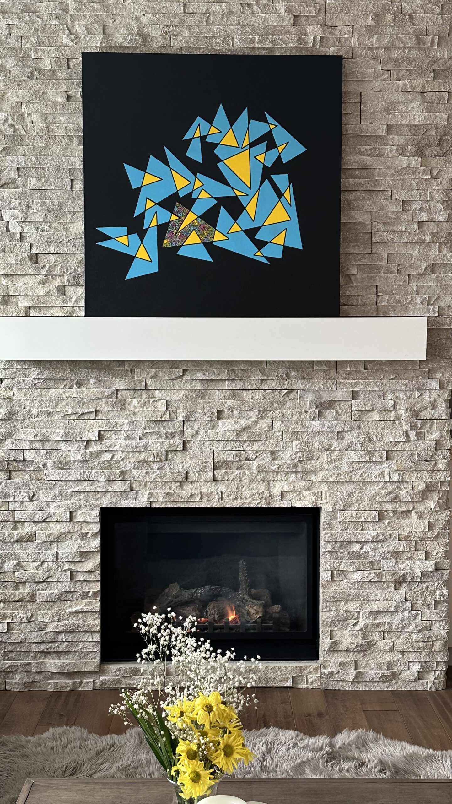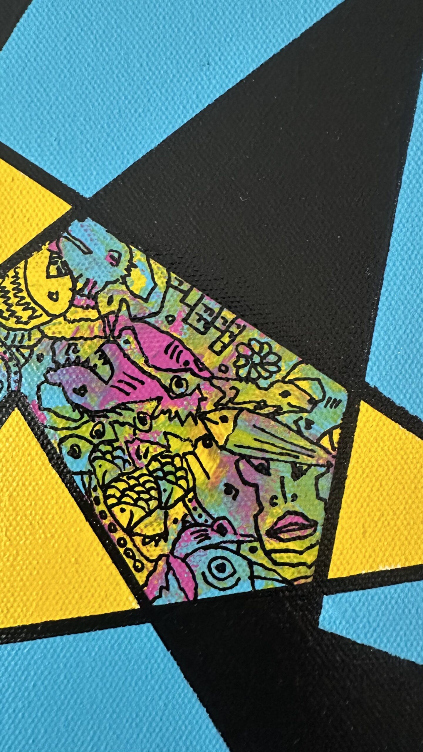 At the center, a multicolored triangle stands out as a signature element, reflecting the my artistic process of discovering shapes within layers of color, much like finding images in clouds.