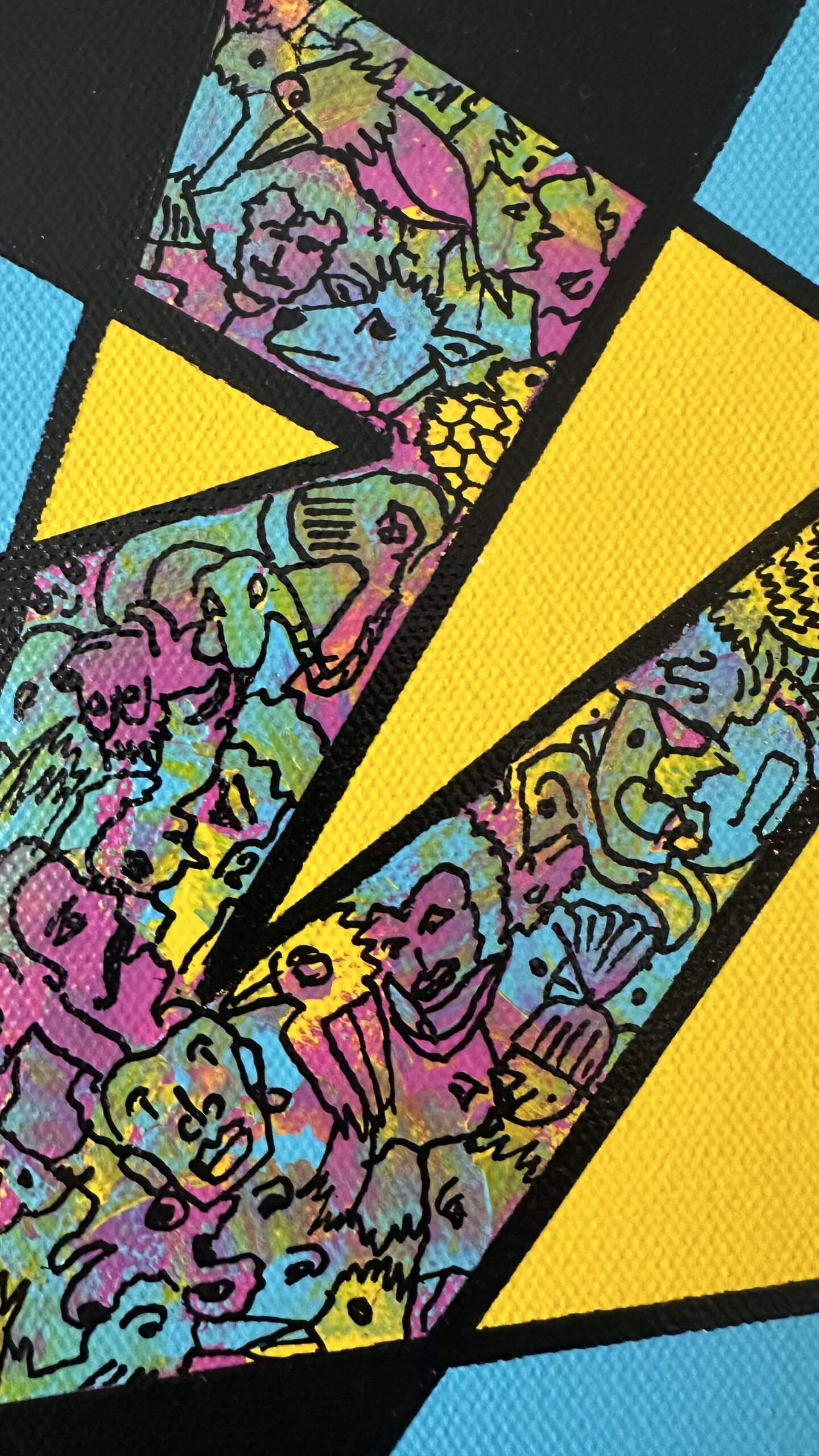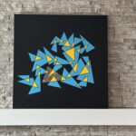 A constellation of sharp, interlocking triangles unfolds across a dark background, with turquoise forms and vivid yellow accents resembling fragmented bird beaks—suggesting a lively, abstract gathering in motion.