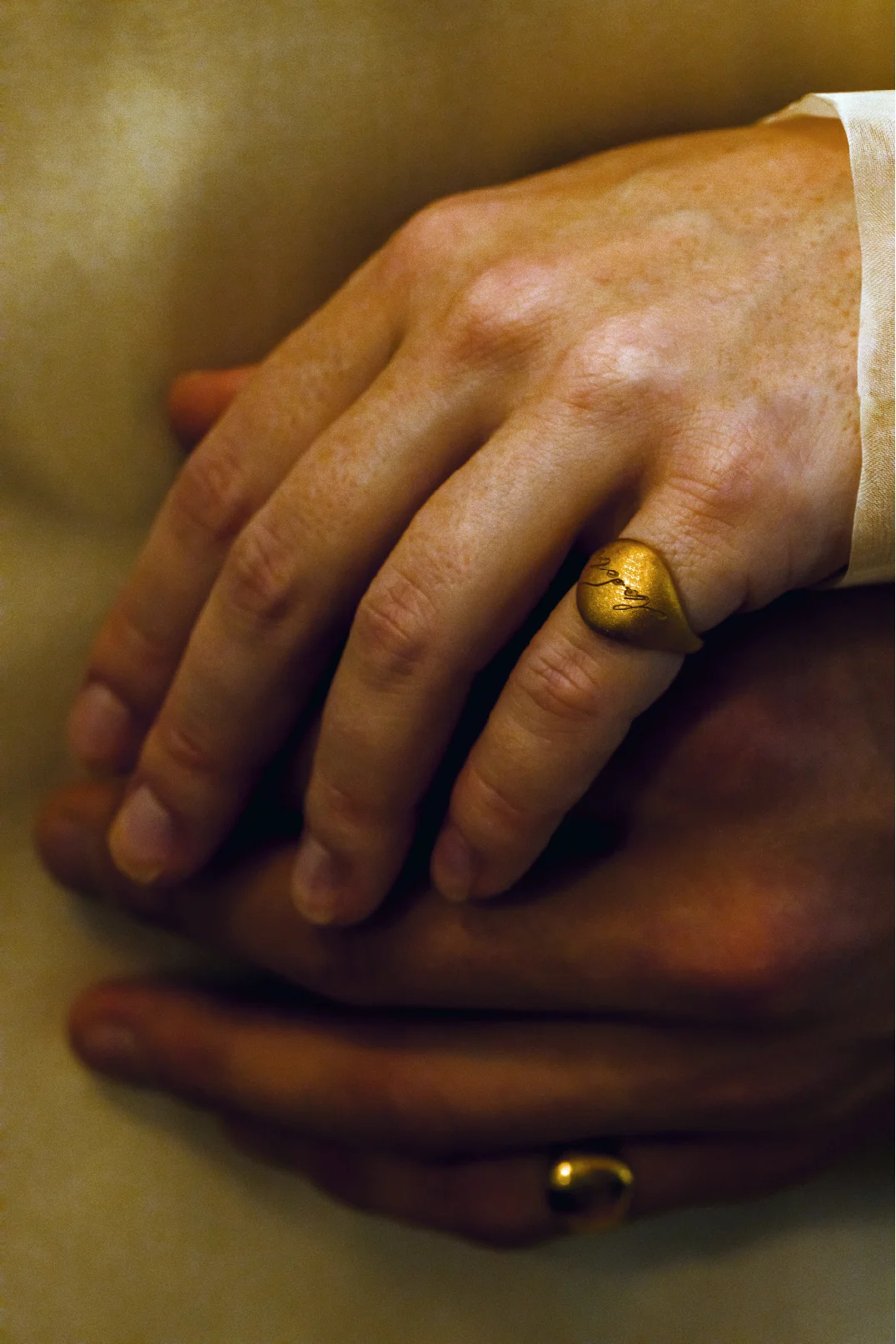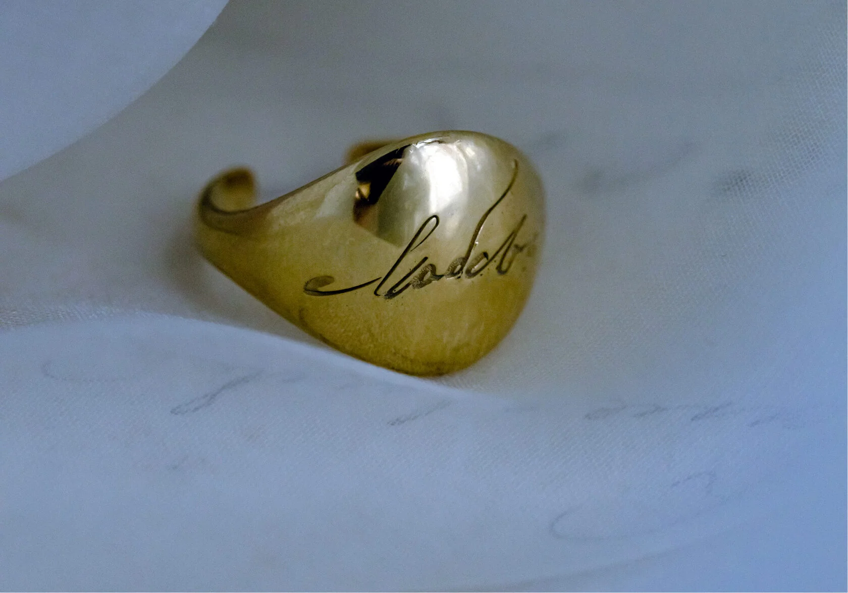 L’ubov’ – “love” in Russian, we reproduce the actual spelling of this word by the poet – on the mirror glossy surface. The ring can be worn as a phalanx or on the little finger.