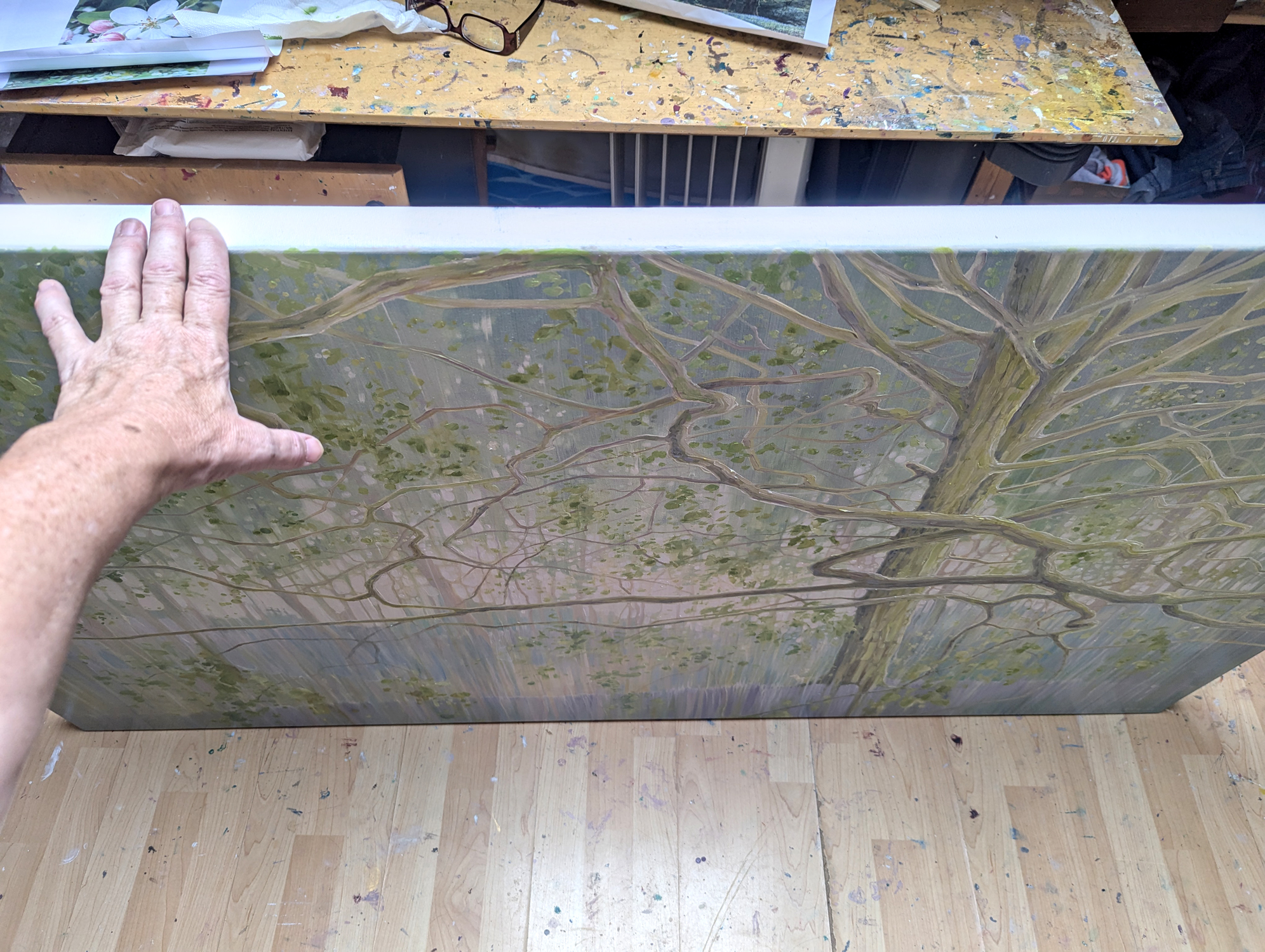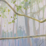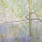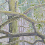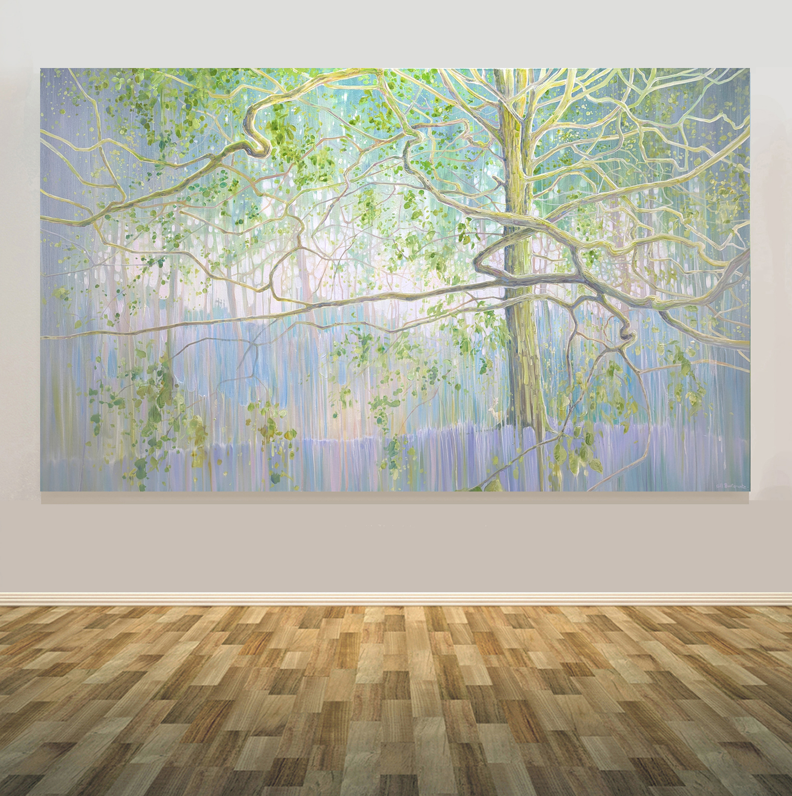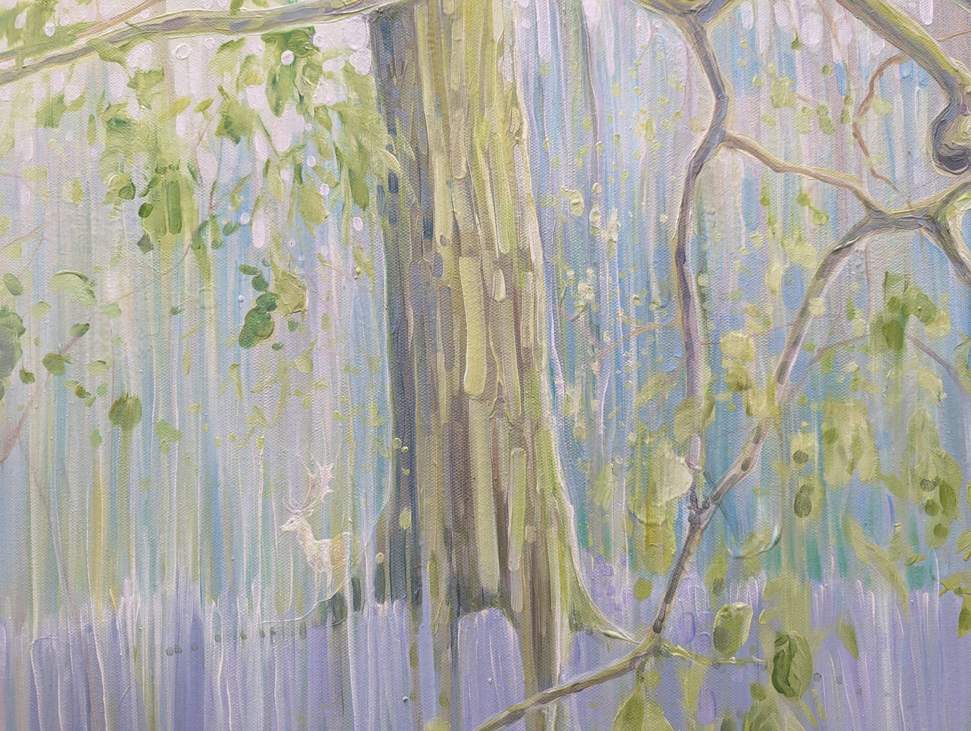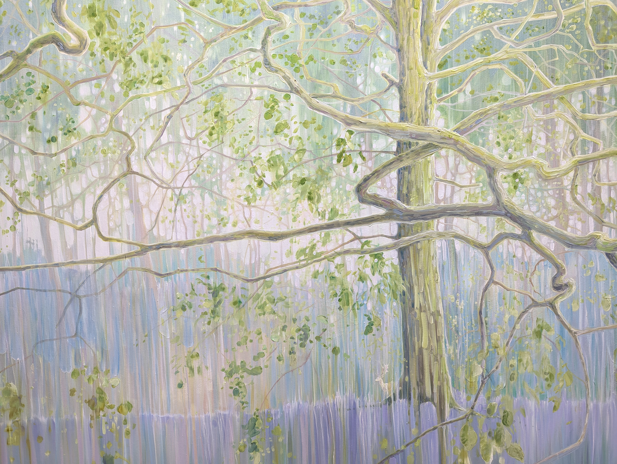 The Mother Tree is a very large, impasto, semi-abstract oil painting of a tree in a bluebell wood with deer.