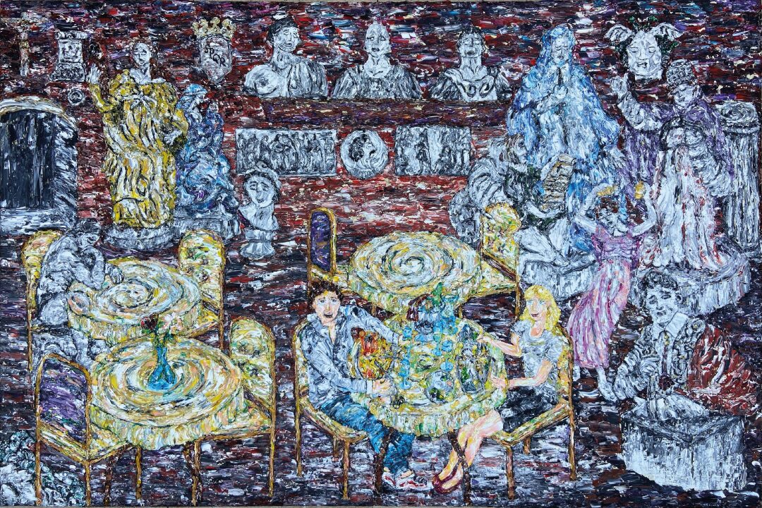 The restaurant, with its unique charm, is furnished with numerous plaster copies of Antonio Canova’s works, creating a suggestive and romantic atmosphere, which seemed suspended over time. But the work does not limit itself to representing that dinner. The title of the work “The Night Goes On” stimulates the idea that that evening did not end at the restaurant table, but that it was only a part of an experience that continued unexpectedly, leaving room for the imagination of the viewer about what happened next.