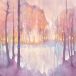 The Thin Place Beckons is a very large semi-abstract original oil painting showing deer gathering beyond a lake in a heart shaped forest at twilight. It is 48x48x1.5 inches.