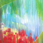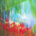 The Portal is a large shimmering red and green, summertime and white horse inspired landscape painting.