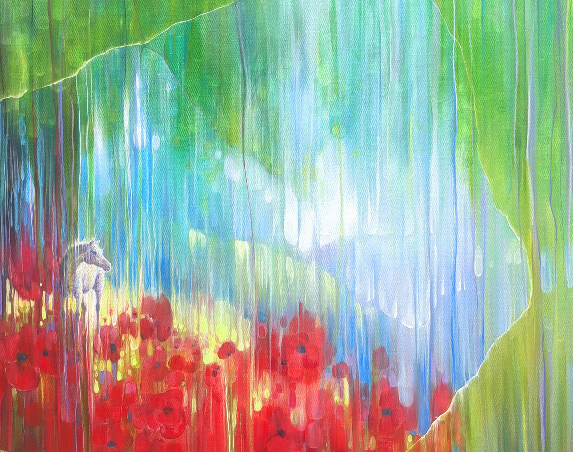 The Portal is a large shimmering red and green, summertime and white horse inspired landscape painting. It is a 36x36x1.5 inches oil on canvas. The style is semi-abstract and ethereal. The painting shows a white horse looking out over a hazy abstracted landscape that hints of hills, trees, sea and summer trees. In the foreground are art-nouveau style poppies contrasted against a curtain of green foliage. A portal shows the mare and the clearing she stands in. The painting was made by layering transparent paint so that the verticals of it seem to shimmer and shift around a little as you look at it. The inspiration was a recent walk along the cliffs and hills and woodland glades of Dorset which are a little fairy tale-like in places. I did not add a unicorn as that is going too far but I think the white mare was the next best thing. Painted on deep edge canvas, white edges, no frame needed and ready to hang. Comes with certificate of authenticity. https://www.youtube.com/watch?v=7-AfLZUT9i4