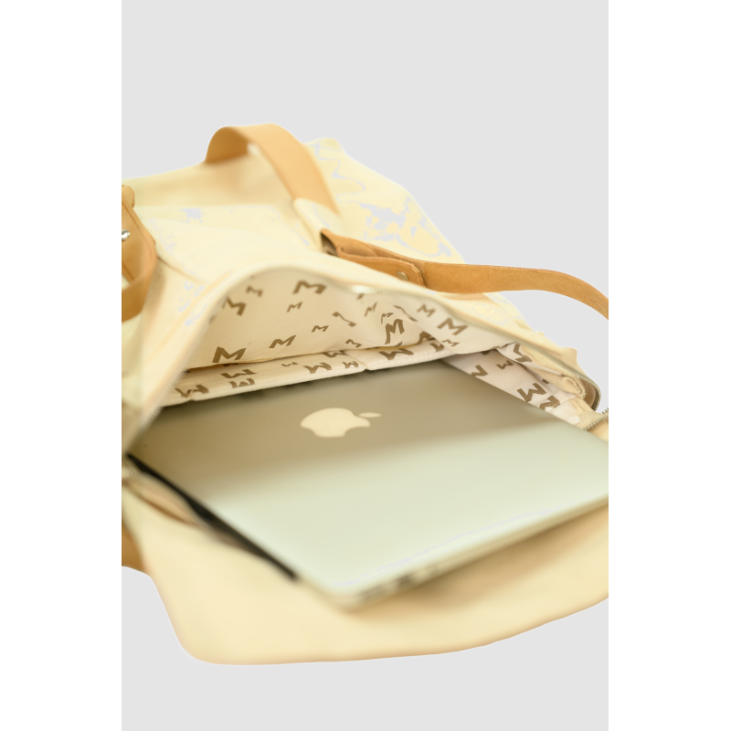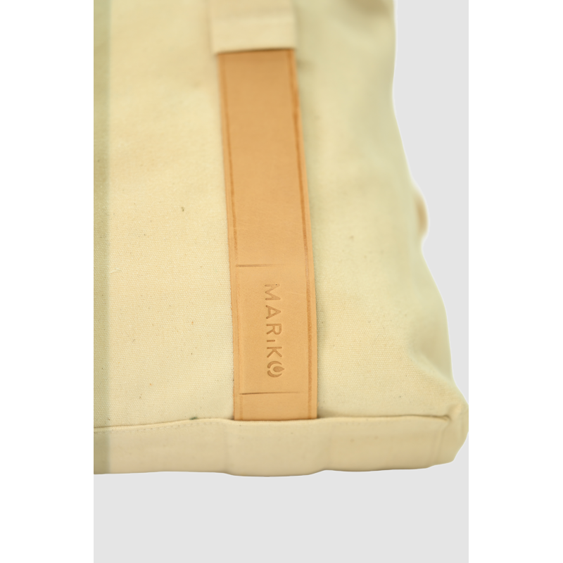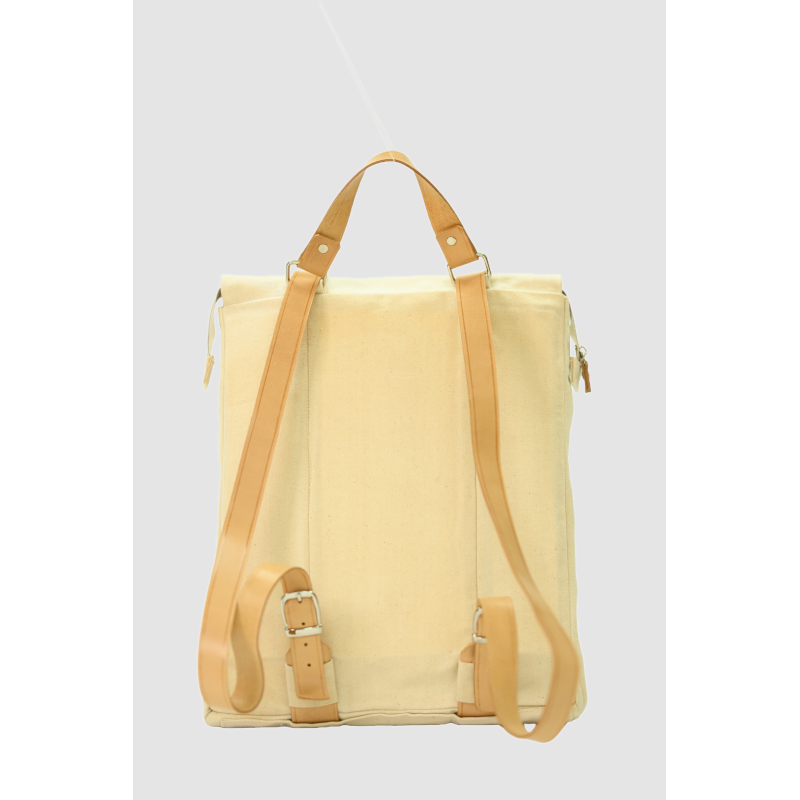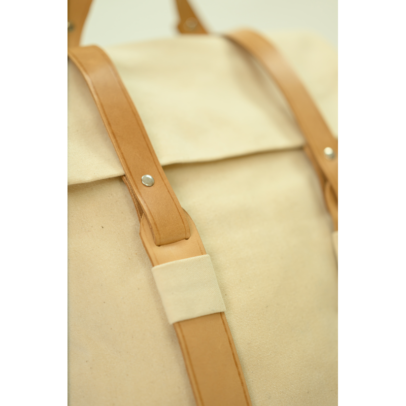 Clean lines, timeless presence. Fully lined, with a laptop sleeve inside. The leather harness is removable, and you can choose your canvas color from the swatch card in the photos.