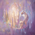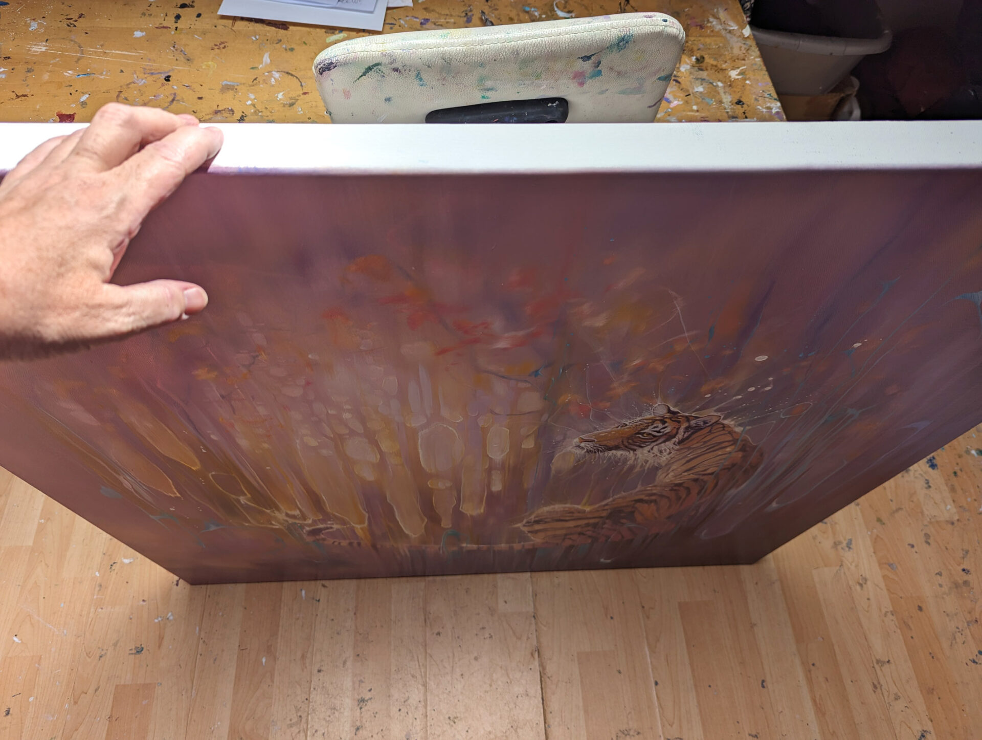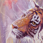 Tiger in the Purple Ether is a 40x40x1.5 inches purple oil painting of a semi-abstract art-nouveau style tiger against an abstract background. The style is slightly art nouveau and makes use of the complementary colours of purple with yellow and orange with blue which makes the colours very vibrant and almost mystical. The background hints at trees and light behind them but is quite abstract. The tiger herself has a pensive expression and looks kinder than most tigers. She appears to be dissolving into the ether (ether being a spiritual idea) and has sparkles of light or energy flowing out from her. In reality, tigers really are in danger of dissolving out of existence so the message is quite poignant. Painted on deep edge canvas, white edges, ready to hang and comes with certificate of authenticity and gifts from the artist.