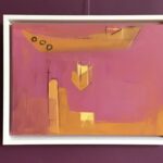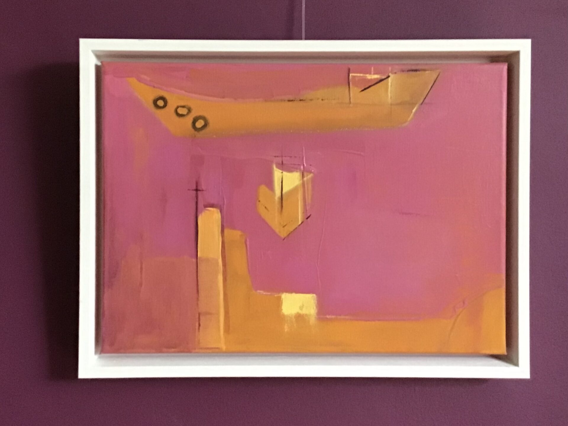 This work is based on the drawings and mixed media studies done on location of a dredger working up and down the Rock Estuary in North Cornwall and consequently turning side on and then to face me, with the bow pointing directly towards me and then side on. Cangas size 36 x 46 cms, framed in a simple white box frame, framed size 40 x 50 x 4 cms. This painting is currently in Galleri Soho.