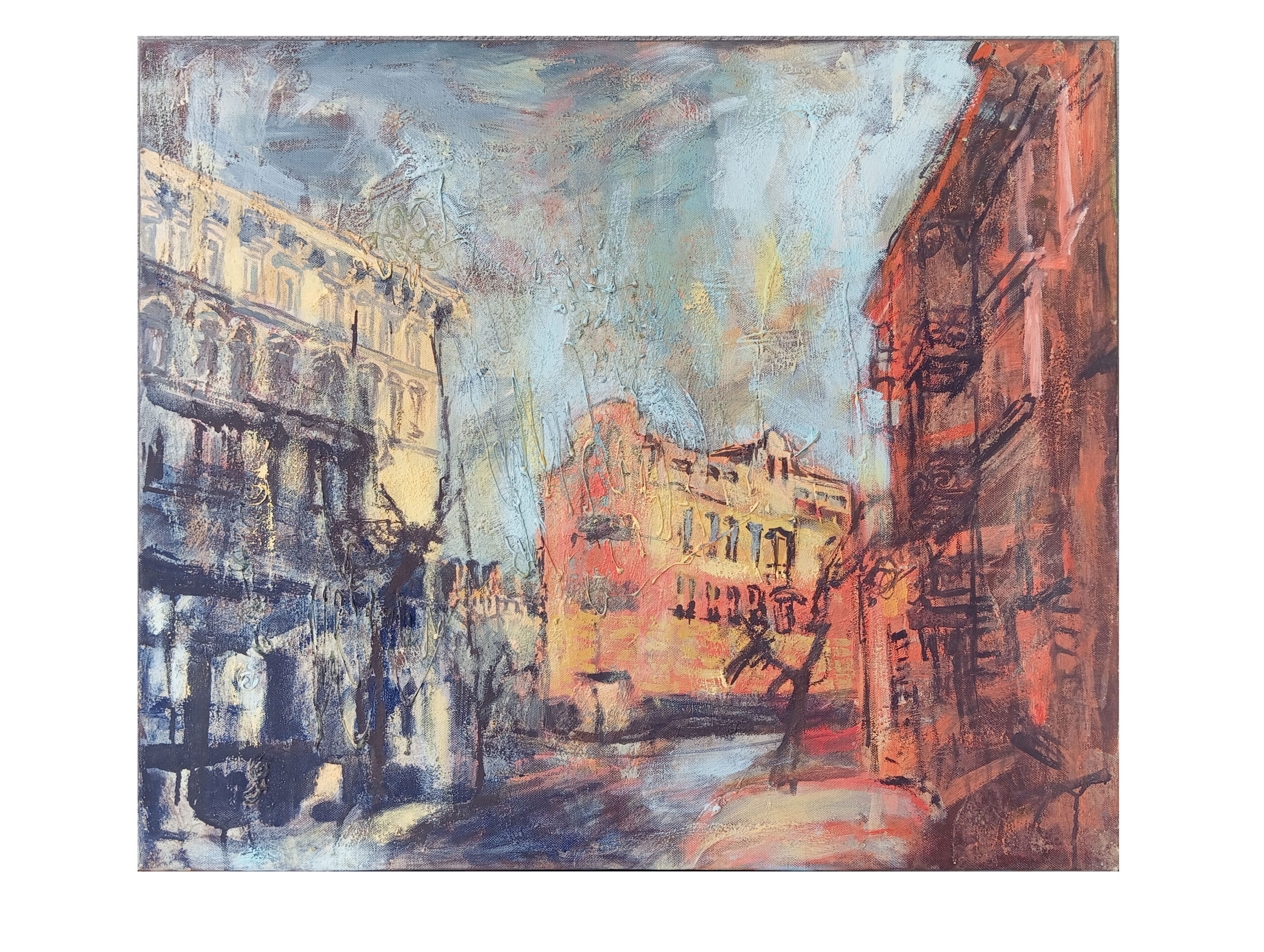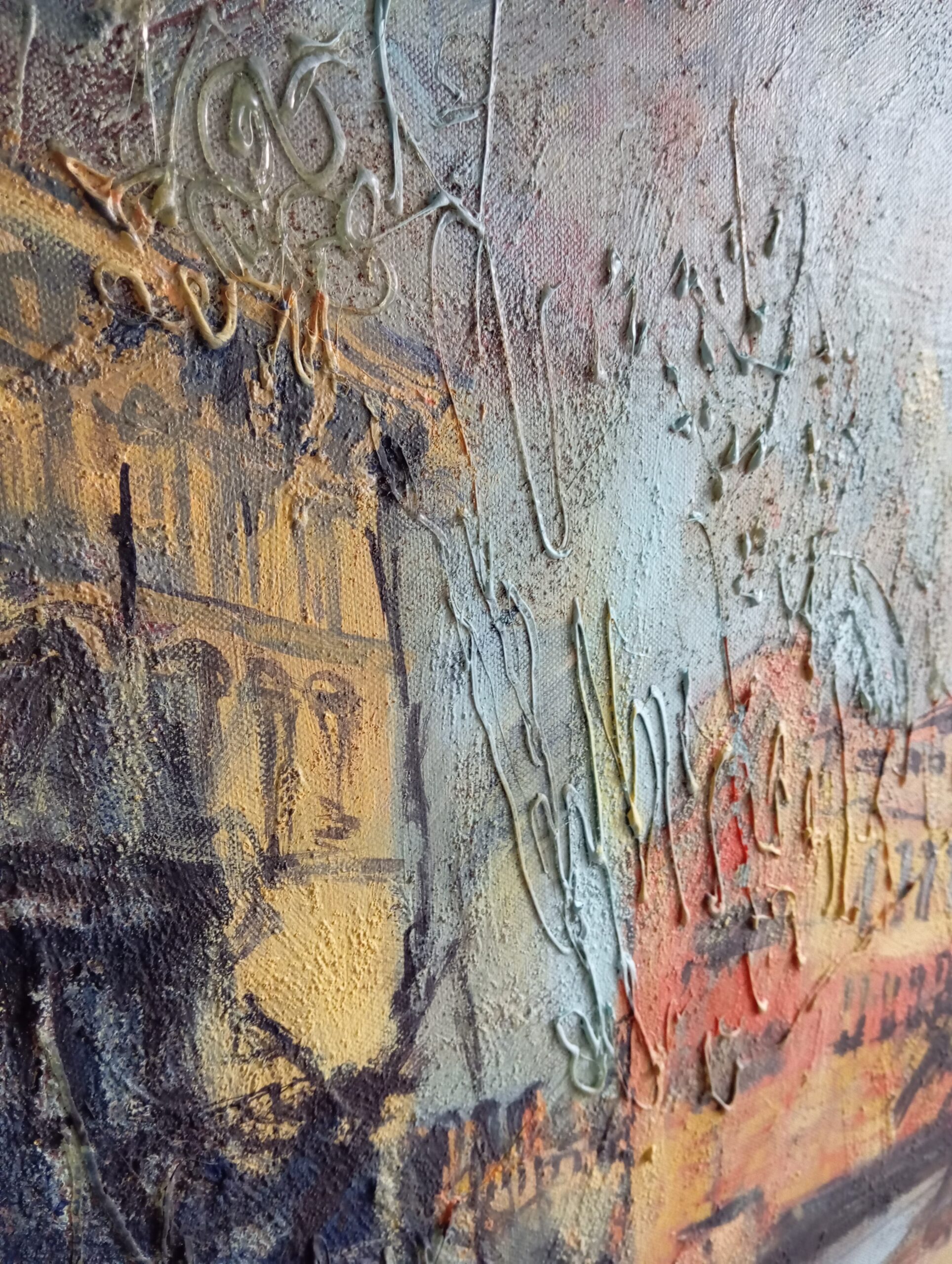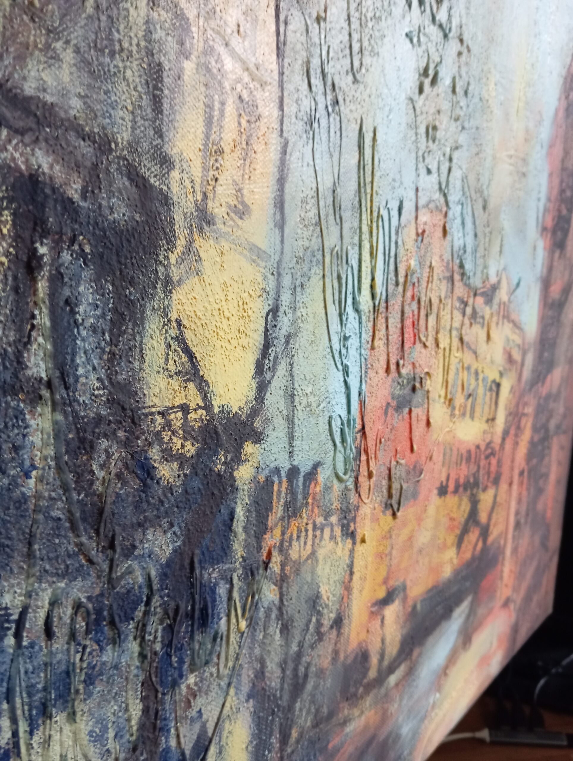 Look closer, and you may notice how our feelings shift, drifting like the clouds that sail across the sky. The trembling of colours and forms intensifies this sense of flow, even as everything hangs suspended in a single, fleeting moment. The painting’s rich texture allows the senses to resonate softly with one another, deepening the viewer’s immersion.