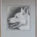 HUNDAR. Svensk vit älghund. Grafitpenna på akvarellpapper Arches 300 g. Silverram med ljusgrå passepartout och glas. 36×40 cm. Glas. Originalmålning signerad.