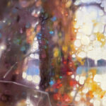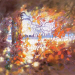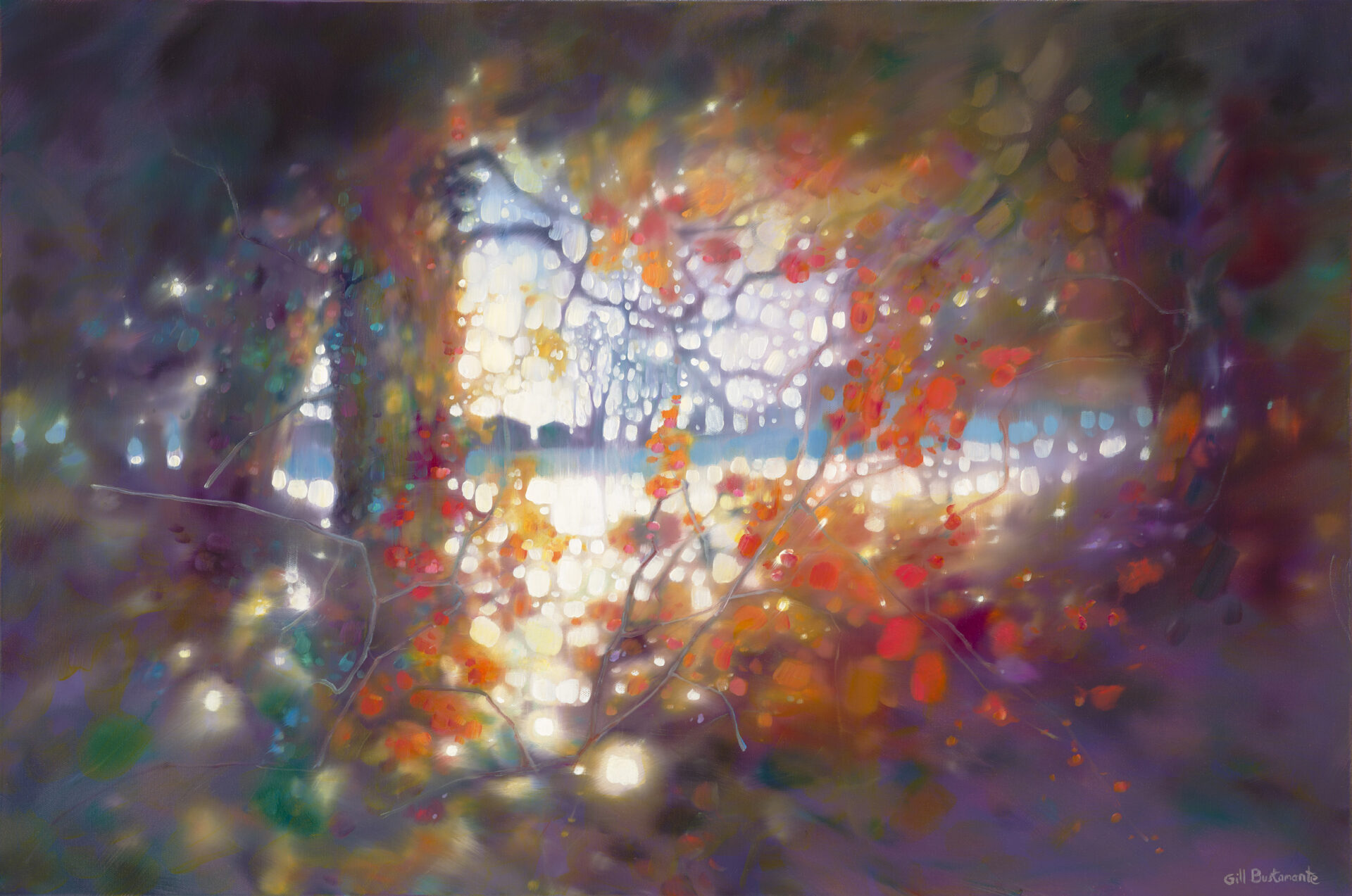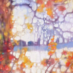 Winter Calling is a colourful English winter landscape with snow glimpsed through the last leaves of autumn. It is 36x24x1.5 inches.