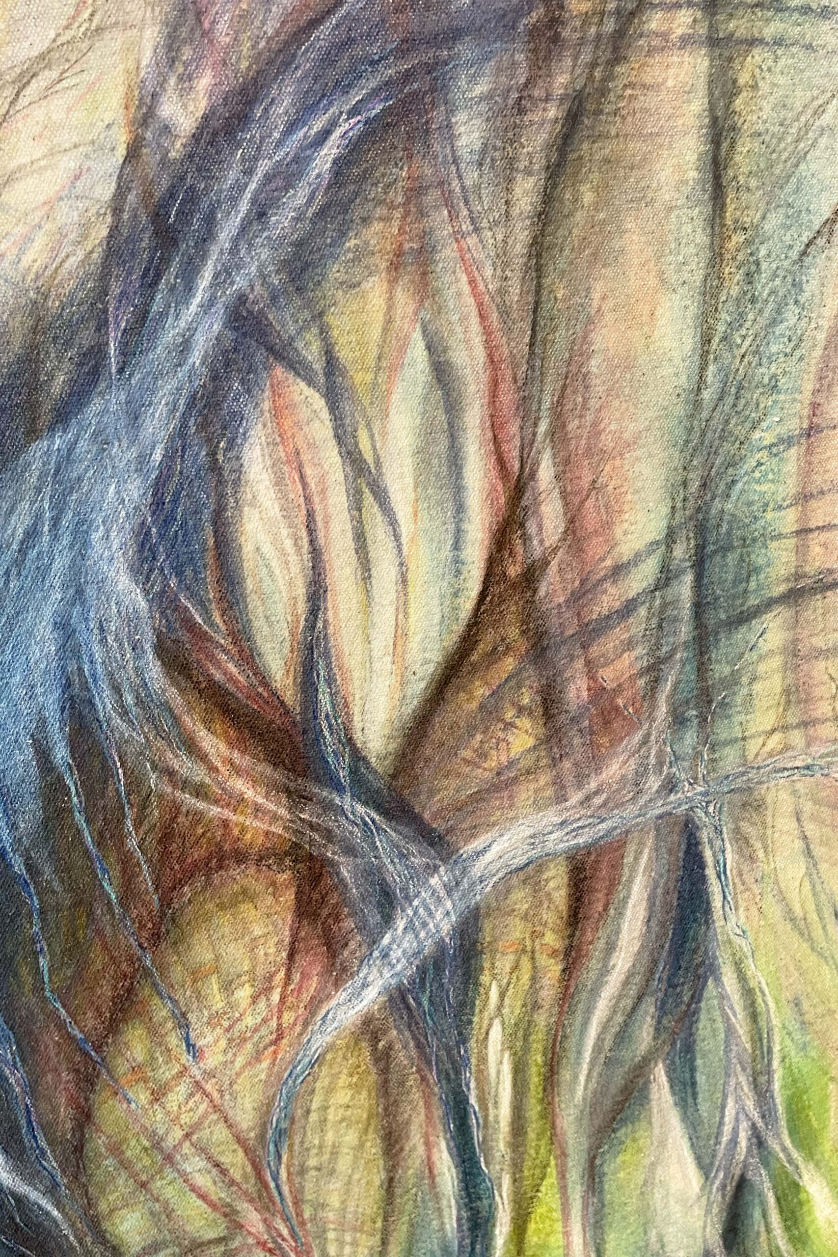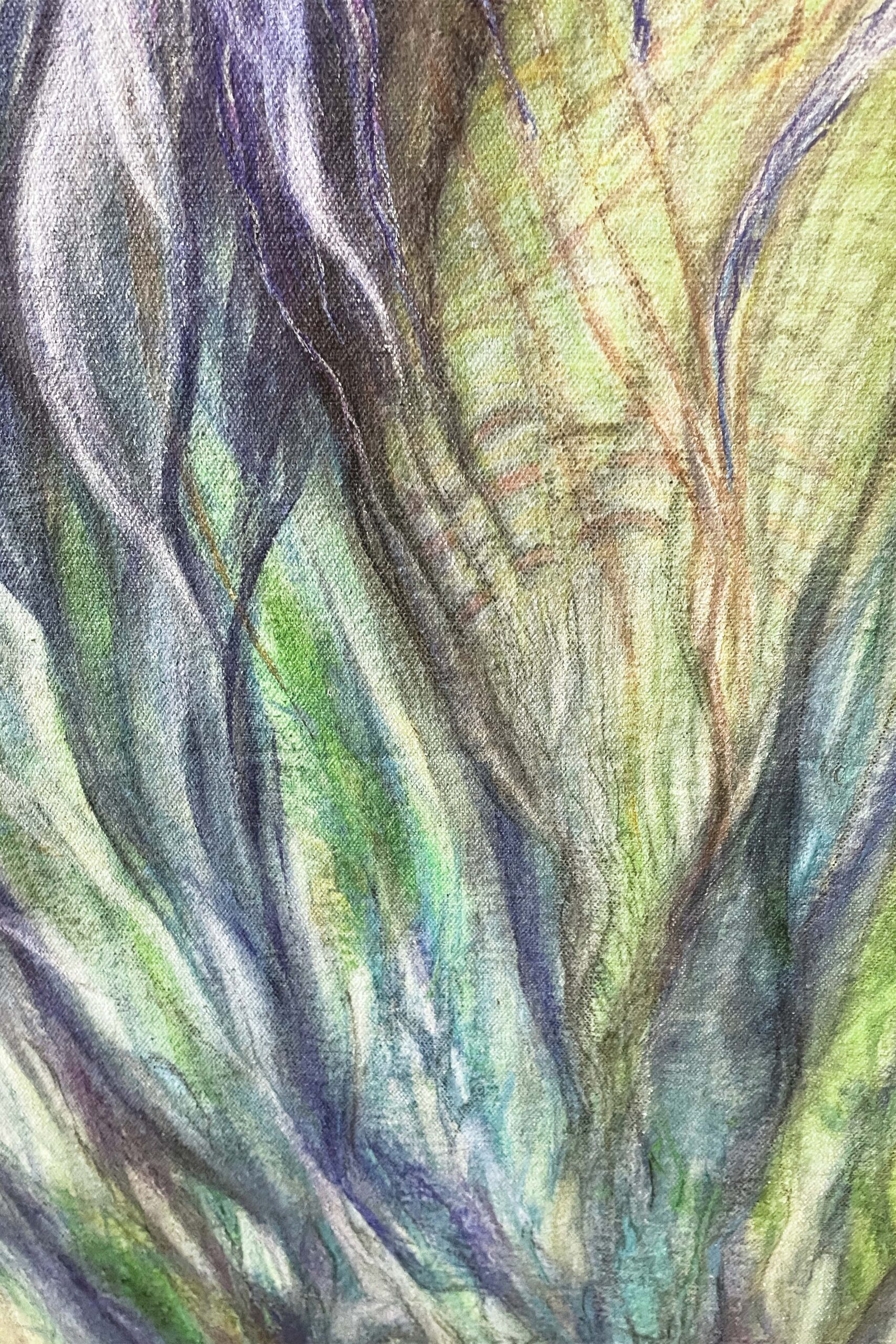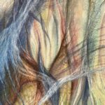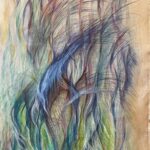Wall Hanging/Mixed Media Painted Tapestry on raw canvas with frayed edges. Media: Water Color, Charcoal, IntenseInks, Pastels, & Acrylic. A simple hanging device (teak wood top hanging system)can come attached, sealed for protection front and back. This unique handpainted tapesty can be rolled up for simple shipping. Dimensions: 29.5″w x 58″h, light weight.